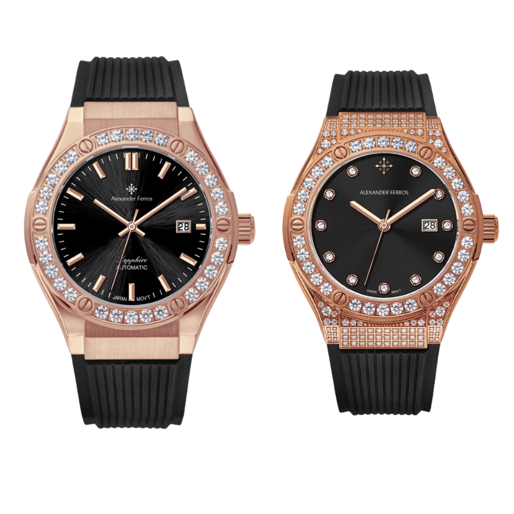 Bộ đồng hồ đeo cặp Alexander Ferros 6161R-01 và 2251FR-01 sử dụng vỏ thép không gỉ 316L mạ vàng hồng kết hợp niềng đính đá và chi tiết vít trang trí, tạo nên phong cách thể thao hiện đại.