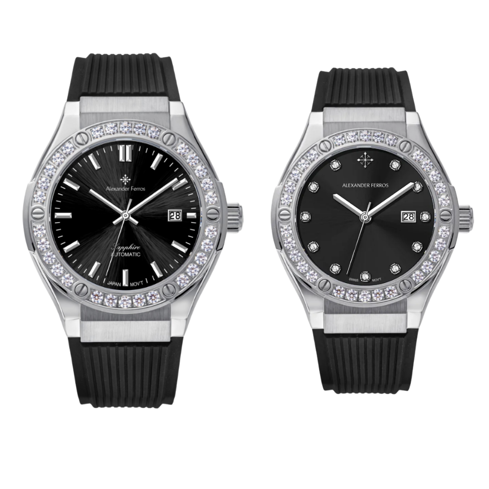 Phiên bản AF 6161S-01 dành cho nam có kích thước 42mm mạnh mẽ, trong khi AF 2251S-01 dành cho nữ có thiết kế thanh lịch hơn với niềng đá tinh xảo. Cả hai mẫu đồng hồ Alexander Ferros đeo đôi đều sử dụng dây cao su đen gân nổi mang lại cảm giác đeo êm ái và phong cách thể thao.