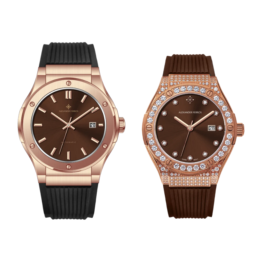 Đồng hồ đôi 6162R-08 và 2251FR-08 có tông nâu vàng hồng sang trọng, dễ đeo. Bản nam mặt nâu vân 3D, dạ quang rõ. Bản nữ mặt nâu sunburst, viền đính đá nổi bật, tổng thể hài hòa đúng chất đồng hồ cặp Alexander Ferros.