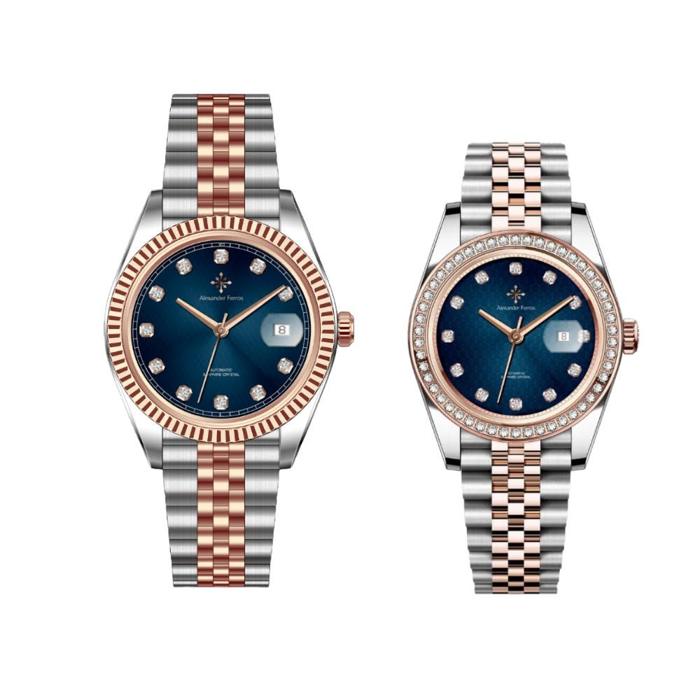 Sự đồng điệu giữa hai thiết kế nam và nữ đã tạo nên một bộ đồng hồ cặp Alexander Ferros 8032D/05 và 8192D/05 hài hòa, thể hiện sự gắn kết và phong cách chung của các cặp đôi.