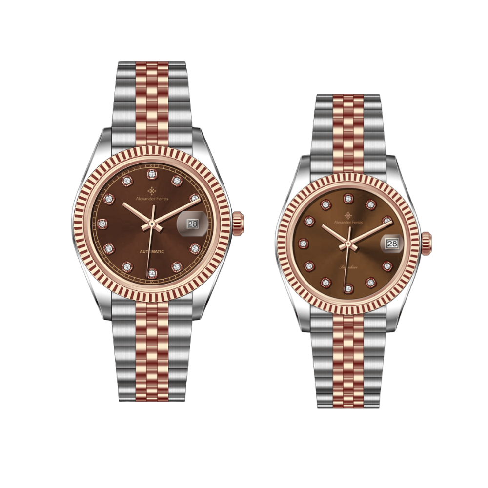 Bộ đồng hồ đôi Alexander Ferros 8132D/08 và 8222D/08 gây ấn tượng với thiết kế demi vàng hồng sang trọng, kết hợp giữa thép không gỉ 316L và các chi tiết mạ vàng hồng nổi bật. Tổng thể thiết kế mang phong cách lịch lãm, lấy cảm hứng từ mẫu đồng hồ kiểu dáng Rolex, tạo nên vẻ ngoài tinh tế và dễ nhận diện.