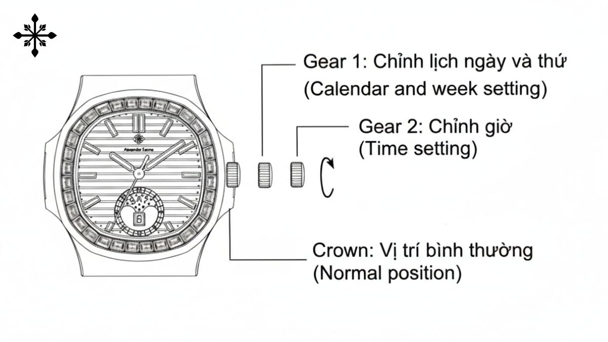 Với đồng hồ automatic có lịch kép (ngày và thứ), núm chỉnh thường có 2 nấc điều chỉnh. Người dùng cần thao tác đúng thứ tự để tránh làm ảnh hưởng đến cơ chế lịch bên trong.