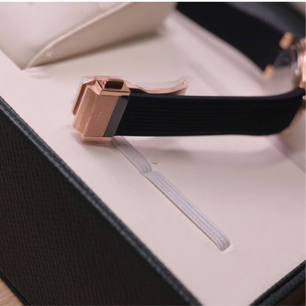 Dây đeo cao su màu đen với thiết kế rãnh dọc mang lại cảm giác đeo mềm mại và chắc chắn. Sự kết hợp giữa dây cao su thể thao và vỏ mạ vàng hồng sang trọng giúp chiếc đồng hồ vừa thời trang vừa dễ phối với nhiều trang phục khác nhau.