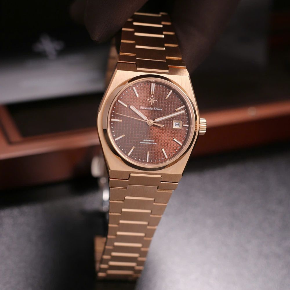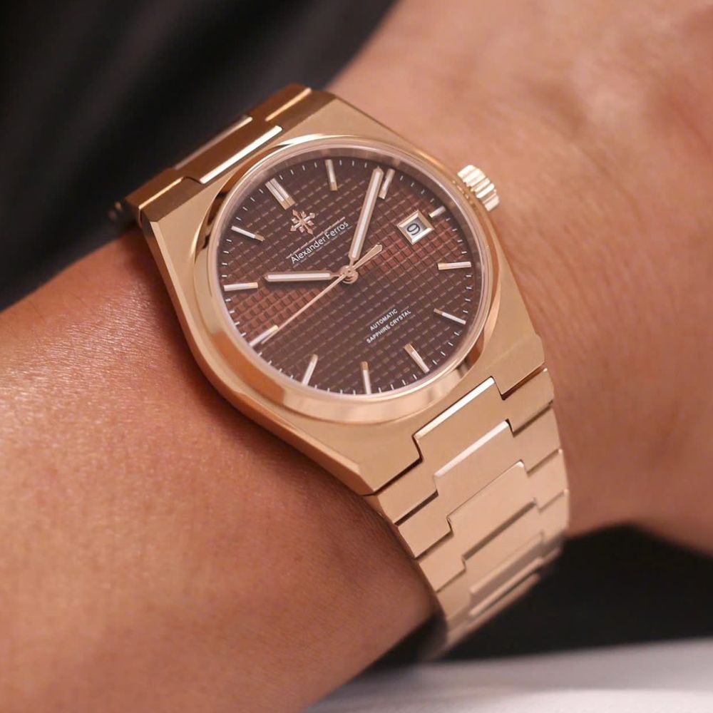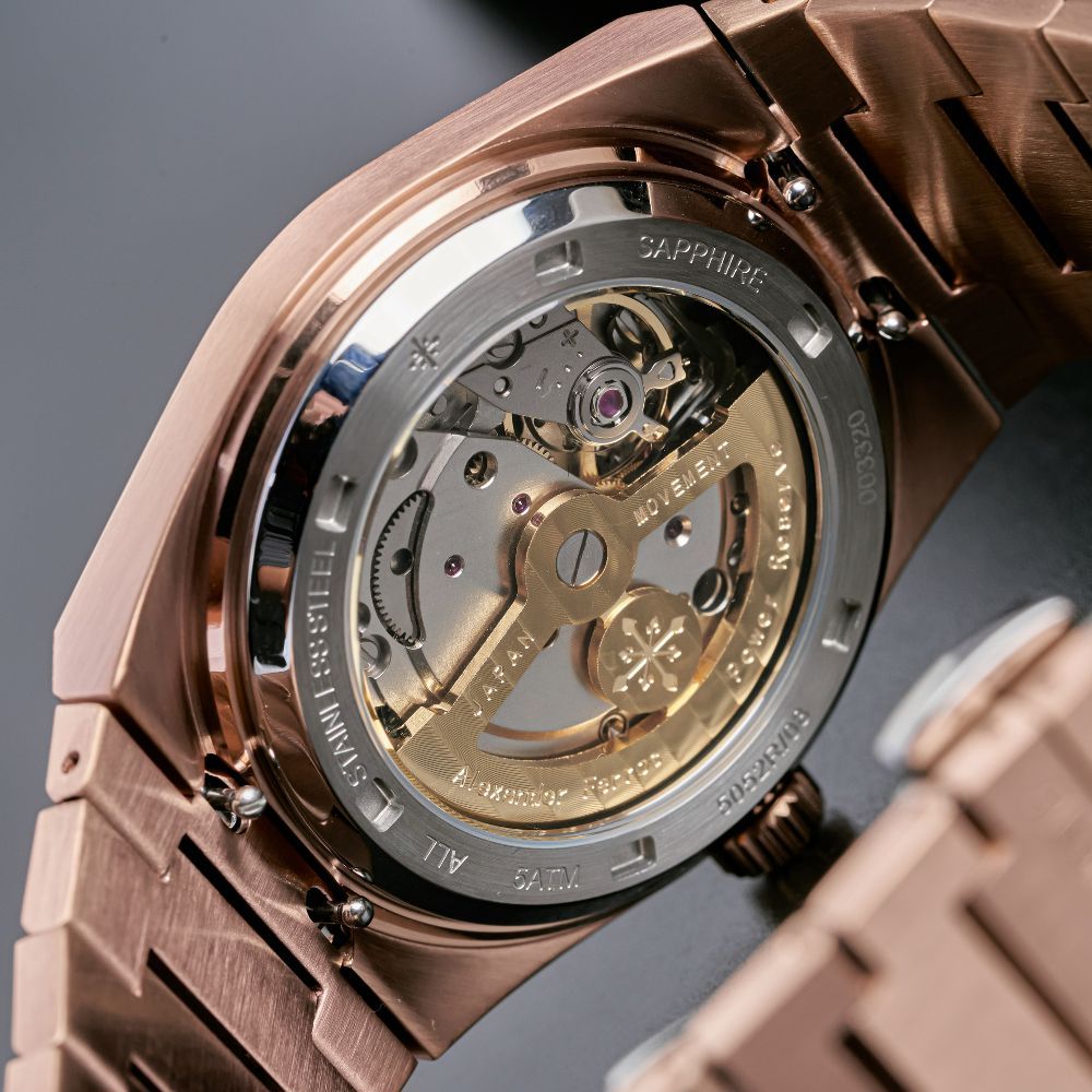 Đồng hồ Alexander 5052R/08 sử dụng vỏ thép không gỉ 316L mạ vàng hồng, tạo nên tổng thể sang trọng nhưng vẫn bền bỉ theo thời gian. Mặt số nâu choco mang sắc thái ấm áp, dễ phối trang phục và làm nổi bật bộ kim cùng cọc số dạ quang, hỗ trợ quan sát thời gian trong điều kiện ánh sáng yếu.