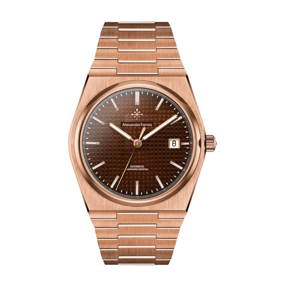 Đồng hồ Alexander Ferros 5052R/08 là mẫu đồng hồ nam nổi bật với mặt số nâu choco trầm ấm kết hợp lớp mạ vàng hồng sang trọng, mang đến cảm giác lịch lãm và khác biệt khi đeo. Phiên bản 5052R/08 được phát triển theo phong cách thiết kế hiện đại, thuộc dòng đồng hồ homage lấy cảm hứng từ các mẫu Tissot nổi tiếng, phù hợp với nam giới yêu thích sự tinh tế và chỉn chu.