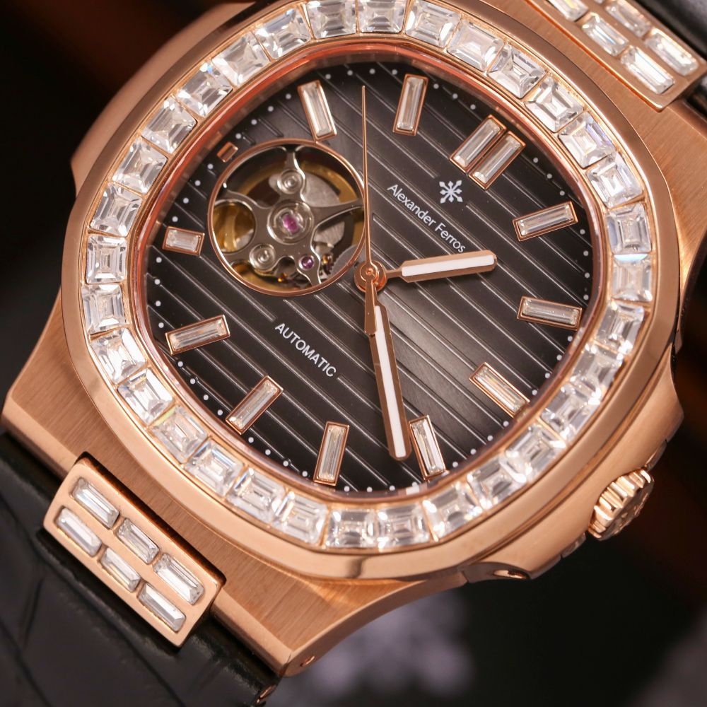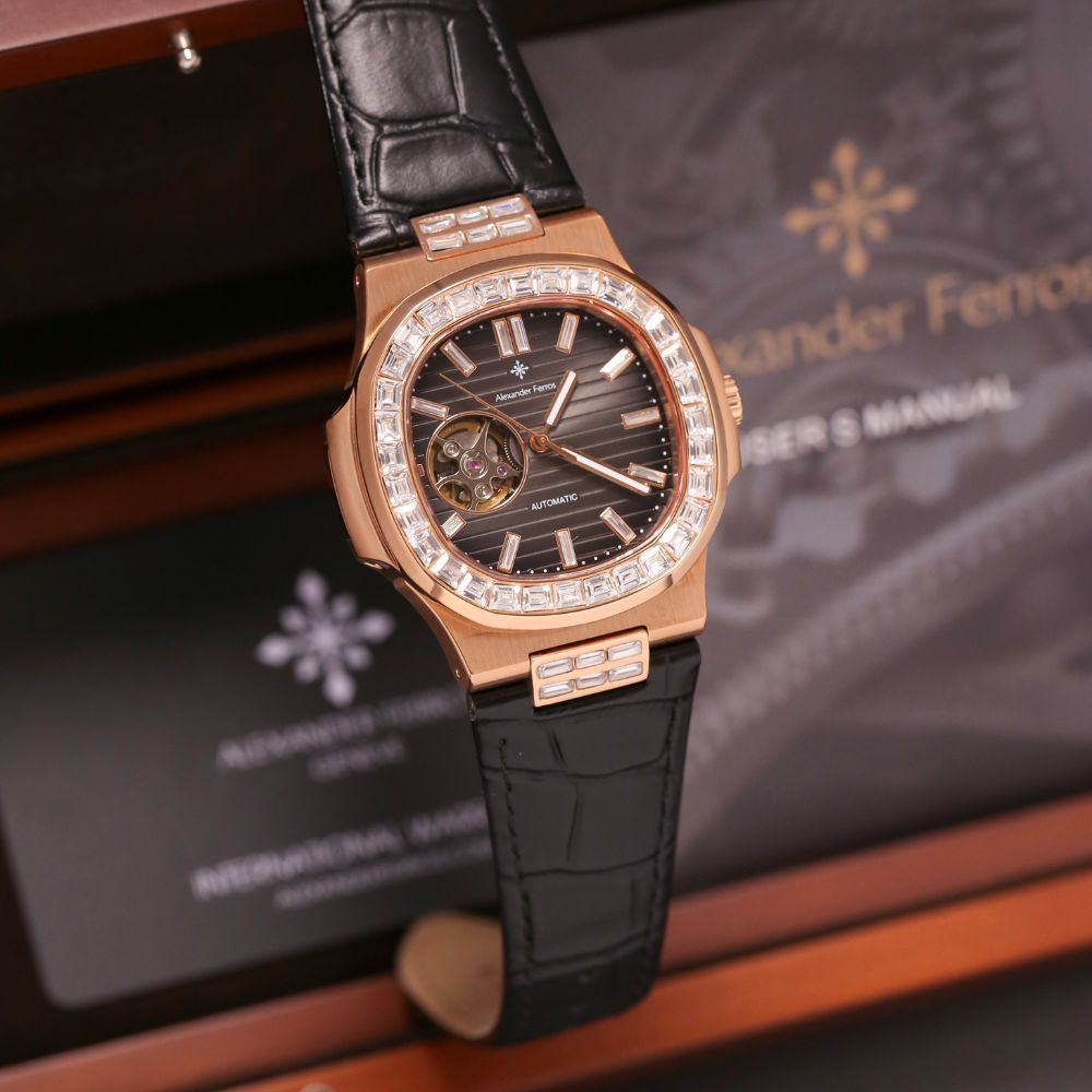 Đồng hồ Alexander Ferros 6091R-01 là mẫu đồng hồ cơ nam mang phong cách lịch lãm hiện đại, lấy cảm hứng từ thiết kế đồng hồ Patek nổi tiếng. Phiên bản 6091R-01 nổi bật với mặt số đen sang trọng, kết hợp lớp mạ vàng hồng tinh tế, phù hợp với quý ông yêu thích vẻ ngoài chỉn chu và đẳng cấp.