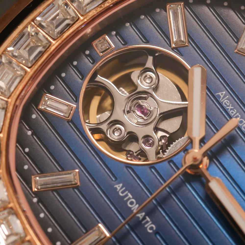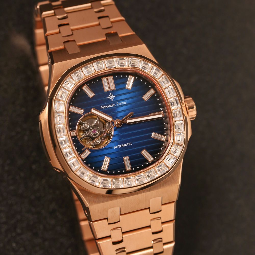 Đồng hồ Alexander Ferros 6091R/05 là mẫu đồng hồ nam máy cơ nổi bật trong dòng đồng hồ Alexander Ferros nam, mang phong cách sang trọng hiện đại lấy cảm hứng từ thiết kế Patek kinh điển. Phiên bản 6091R/05 gây ấn tượng mạnh với tông mạ vàng hồng kết hợp mặt số xanh navy, tạo nên diện mạo đẳng cấp và cuốn hút cho cổ tay nam giới.