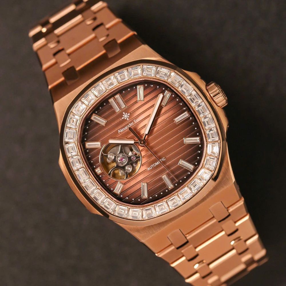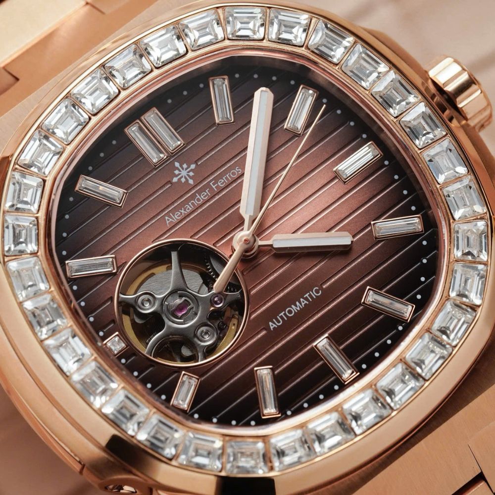 Đồng hồ Alexander Ferros 6091R/08 là mẫu đồng hồ cơ nam nổi bật trong bộ sưu tập 6091, mang phong cách lịch lãm hiện đại lấy cảm hứng từ thiết kế Patek nổi tiếng. Phiên bản 6091R/08 gây ấn tượng với mặt số nâu choco sang trọng, kết hợp lớp mạ vàng hồng tinh tế, tạo nên vẻ ngoài đẳng cấp và cuốn hút cho quý ông hiện đại.