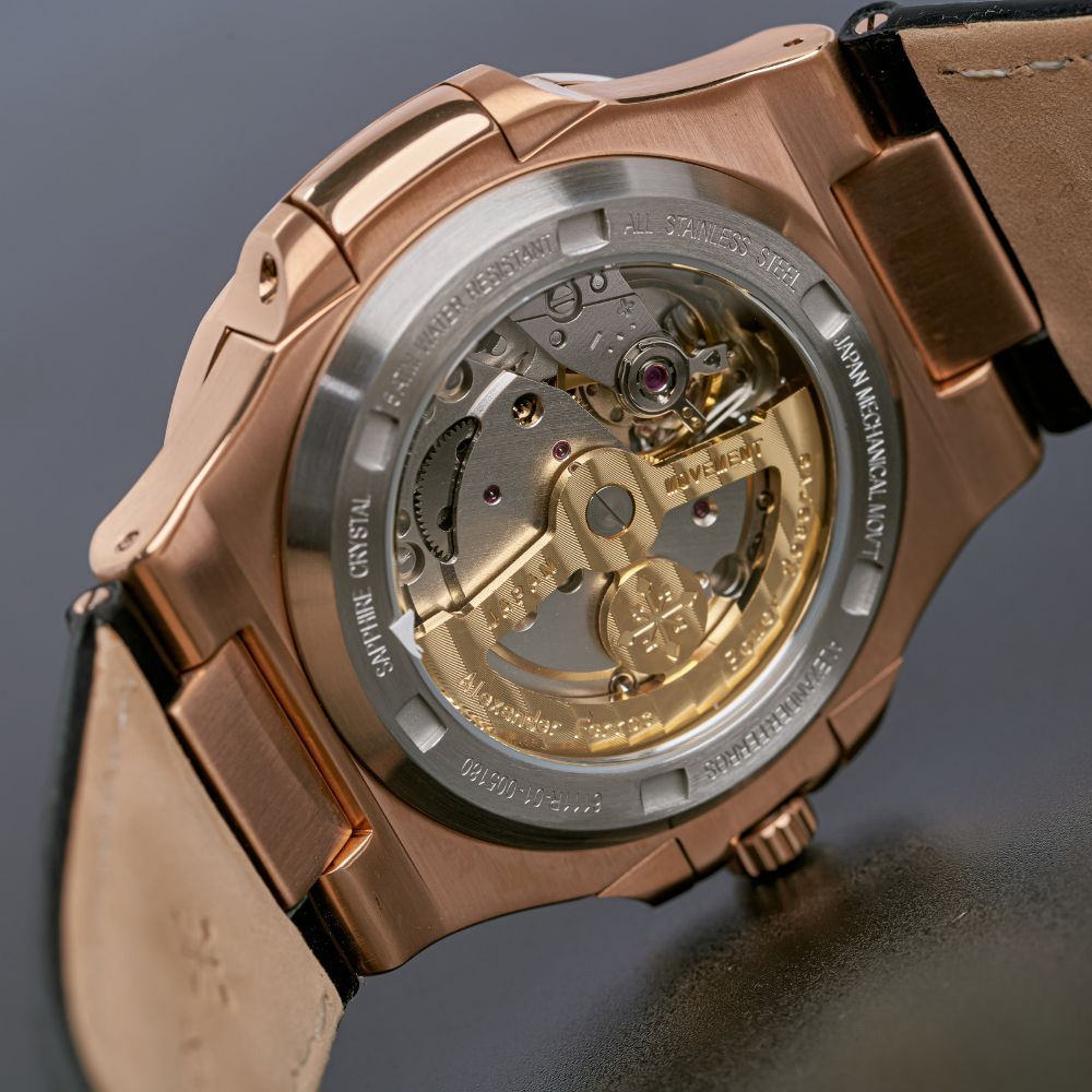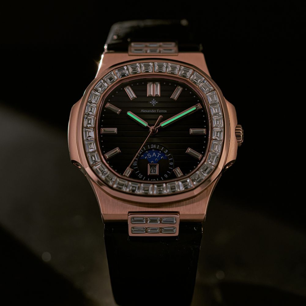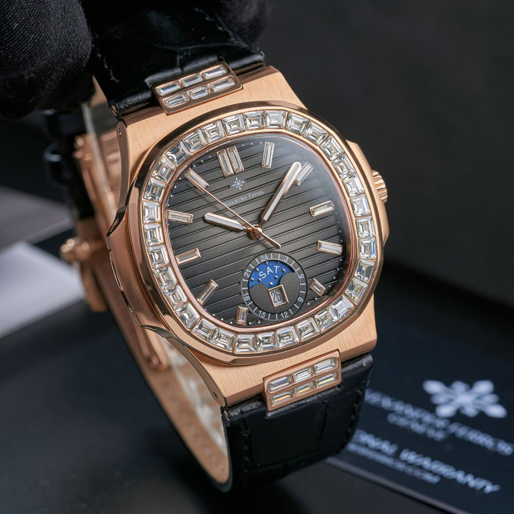 Đồng hồ Alexferros 6111R-01 được lấy cảm hứng từ phong cách đồng hồ Patek nổi tiếng, kết hợp hài hòa giữa nét cổ điển và hiện đại. Vỏ thép không gỉ 316L mạ vàng hồng giúp tổng thể đồng hồ AF 6111R-01 trở nên sang trọng và cuốn hút hơn khi lên tay. Mặt số đen kết hợp cọc số đá và niềng đá tạo hiệu ứng ánh sáng nổi bật, giúp đồng hồ Alexander 6111R-01 dễ dàng trở thành điểm nhấn trong mọi trang phục, từ công sở đến sự kiện trang trọng.