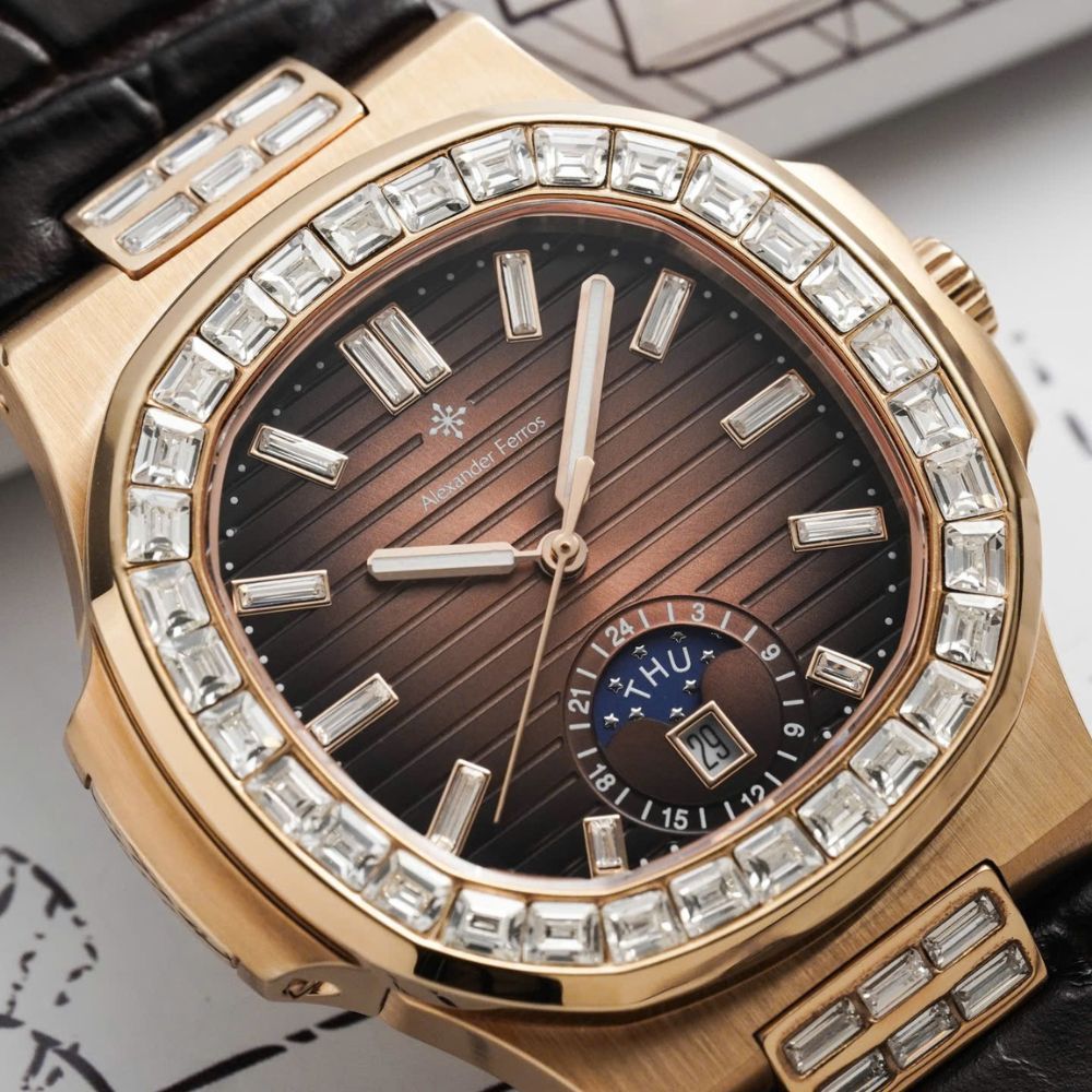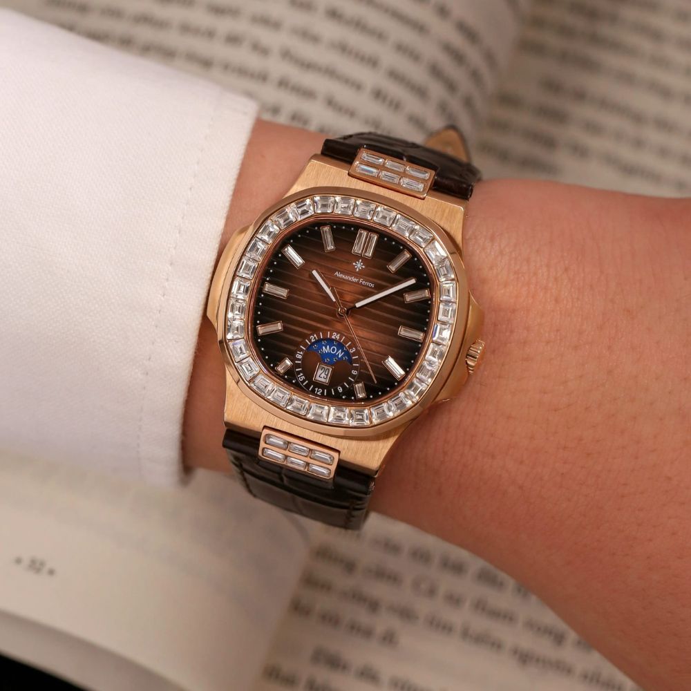 Đồng hồ Alexander Ferros 6111R-08 là mẫu đồng hồ nam cao cấp mang phong cách sang trọng hiện đại, nổi bật với mặt số nâu choco trầm ấm kết hợp chi tiết mạ vàng hồng và niềng đá tinh xảo. Phiên bản 6111R-08 thuộc dòng đồng hồ Alexander Ferros nam, phù hợp với quý ông yêu thích thiết kế lịch lãm lấy cảm hứng từ những mẫu đồng hồ Patek nổi tiếng.