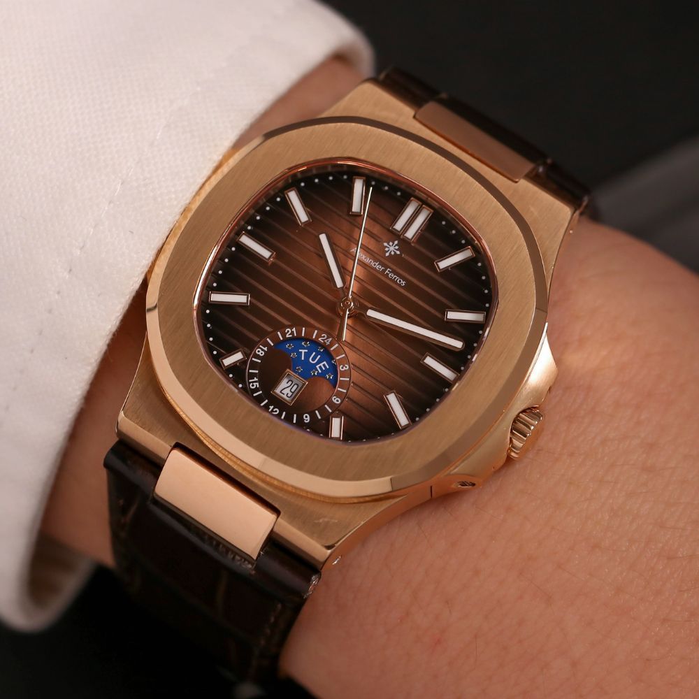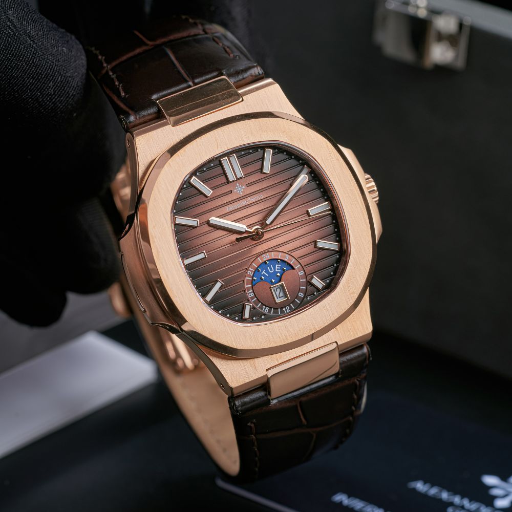 Đồng hồ Alexander Ferros 6122R-08 là mẫu đồng hồ nam mang phong cách hiện đại, nổi bật với thiết kế lấy cảm hứng từ dòng đồng hồ Patek danh tiếng. Phiên bản 6122R-08 gây ấn tượng bởi mặt số nâu choco sang trọng, kết hợp vỏ mạ vàng hồng tinh tế, phù hợp với nam giới yêu thích sự lịch lãm nhưng vẫn cá tính.