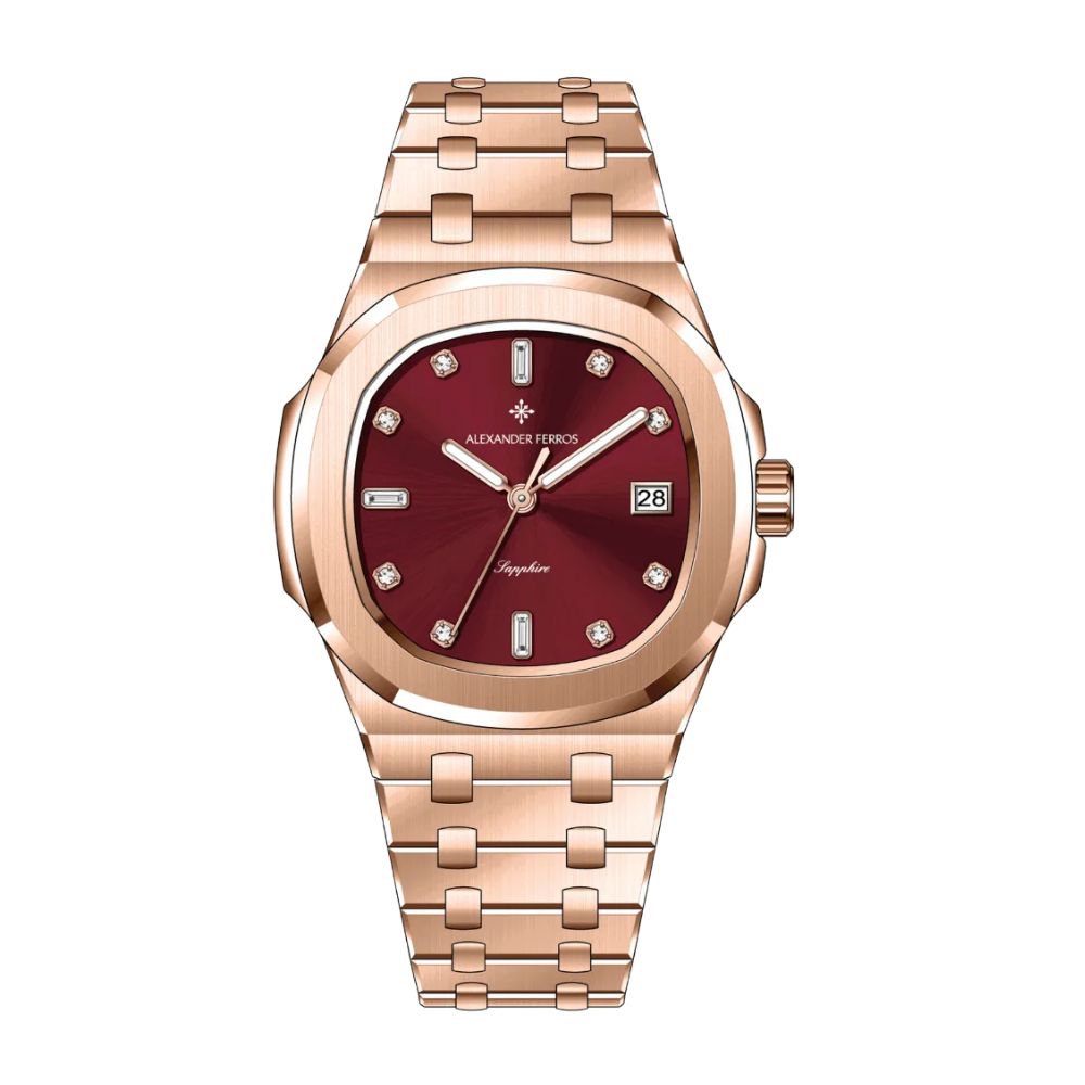 Đồng hồ Alexander Ferros 6152R/03 là mẫu đồng hồ nữ nổi bật với thiết kế vàng hồng sang trọng kết hợp mặt số đỏ rượu vang cuốn hút. Mang phong cách đồng hồ AF lấy cảm hứng từ mẫu đồng hồ cơ kiểu dáng Rolex, sản phẩm toát lên vẻ lịch lãm, hiện đại và dễ đeo trong nhiều hoàn cảnh.