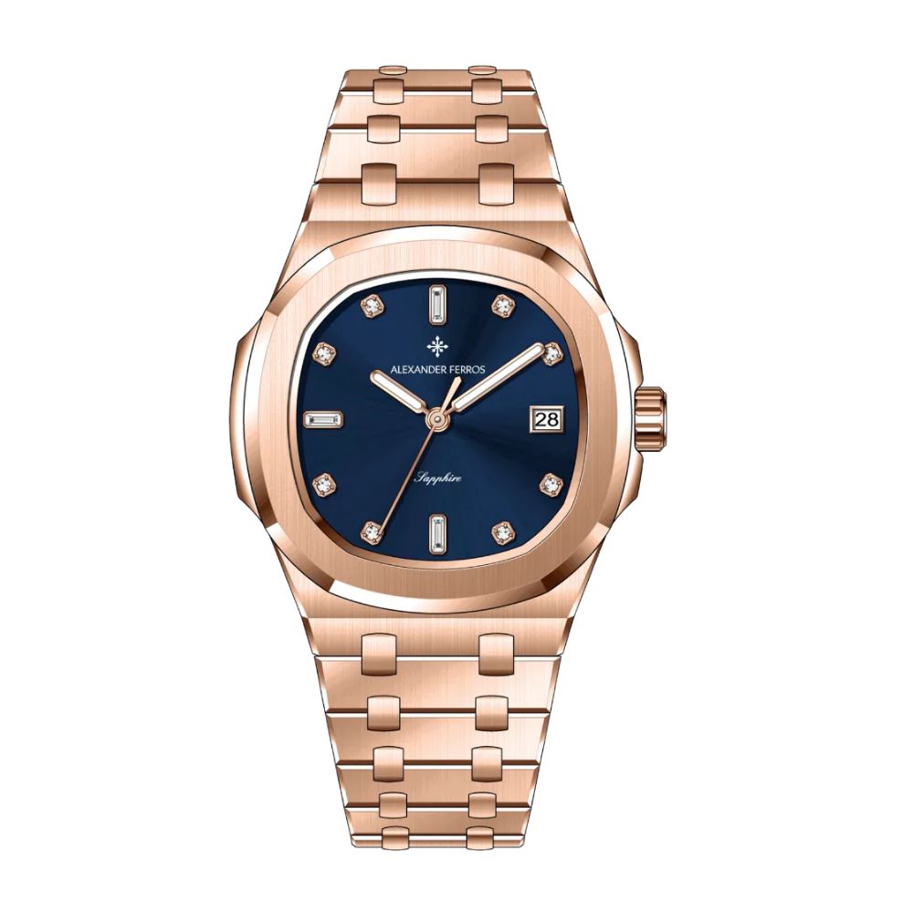 Đồng hồ Alexander Ferros 6152R/05 là mẫu đồng hồ nam mang phong cách sang trọng, nổi bật với tông vàng hồng kết hợp mặt số xanh navy cuốn hút. Thiết kế theo xu hướng đồng hồ AF lấy cảm hứng từ mẫu đồng hồ cơ kiểu dáng Rolex, tạo nên vẻ ngoài lịch lãm, hiện đại và dễ đeo.