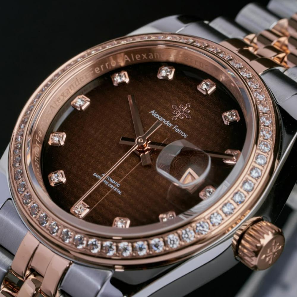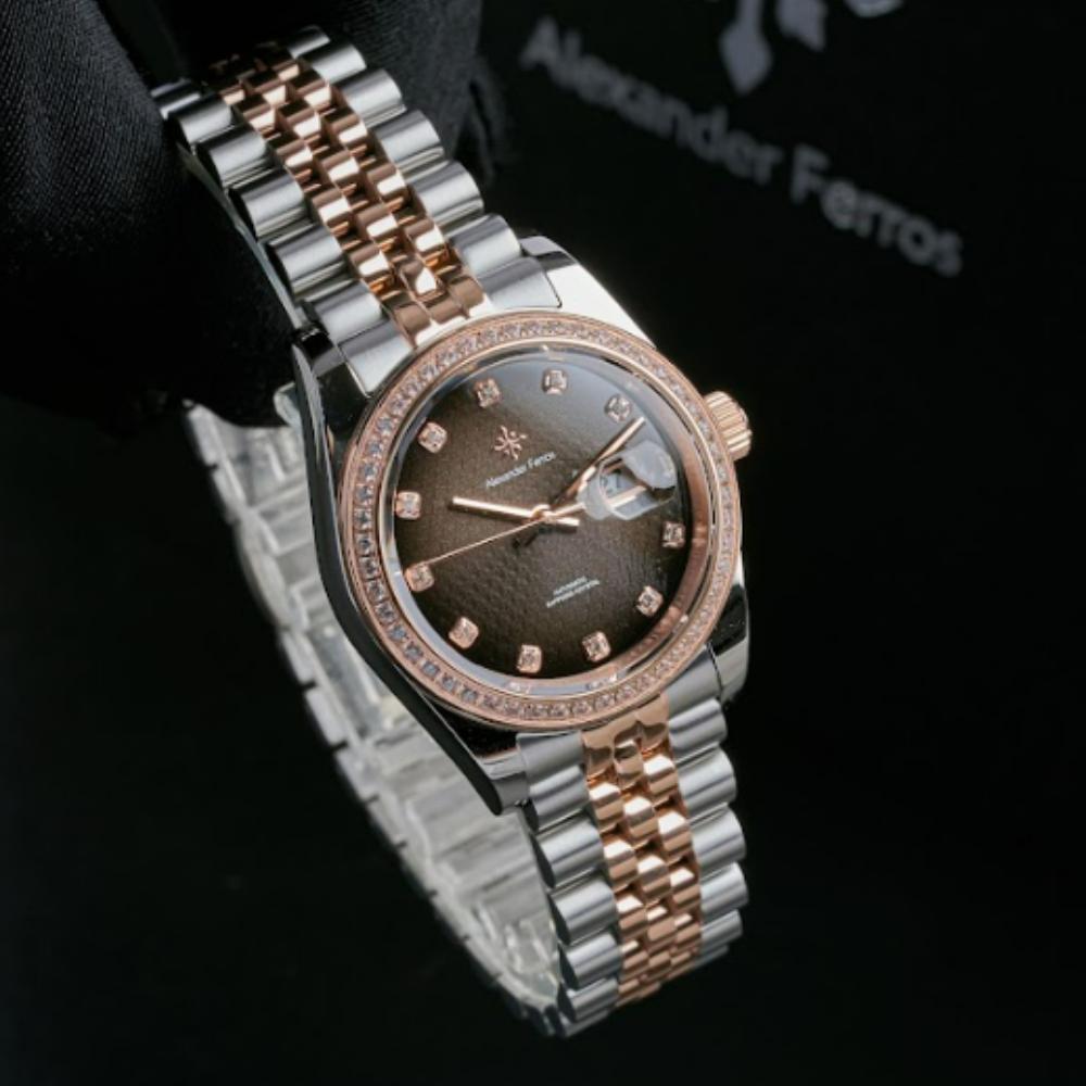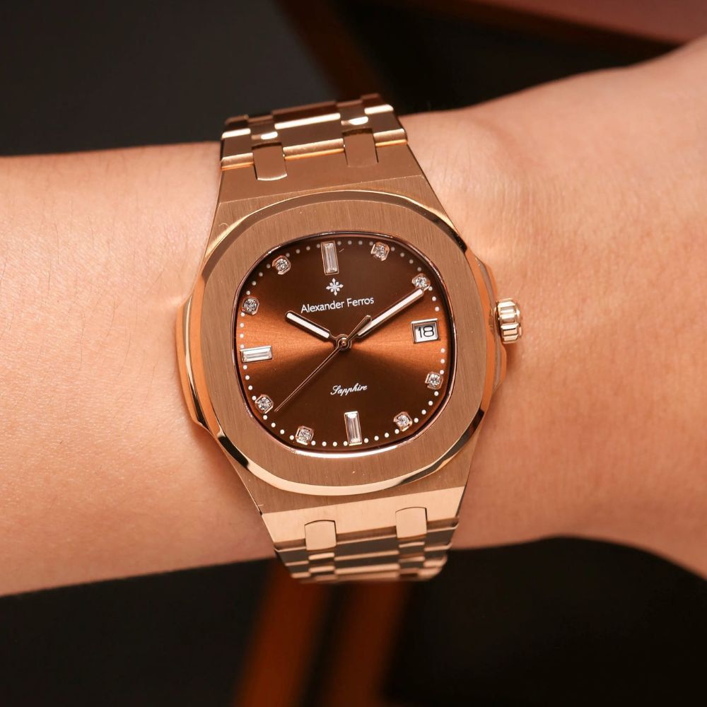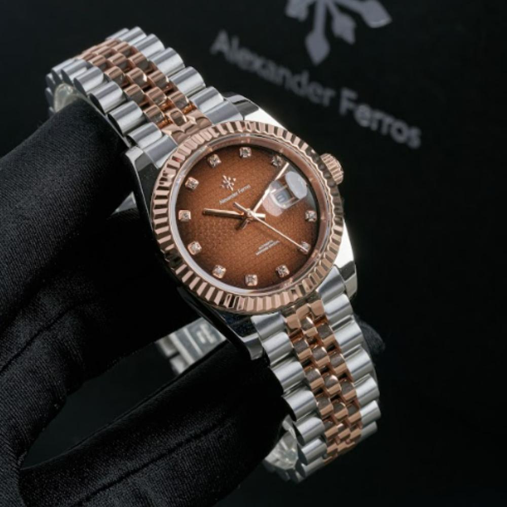 Mặt số nâu choco trên đồng hồ AF 6152R/08 được kết hợp cùng cọc đá sáng và bộ kim tinh xảo, tạo hiệu ứng phản chiếu ánh sáng rõ nét khi di chuyển. Thiết kế này giúp đồng hồ Alexferros 6152R/08 trở thành điểm nhấn nhẹ nhàng cho trang phục công sở, váy dự tiệc hoặc phong cách thanh lịch thường ngày.