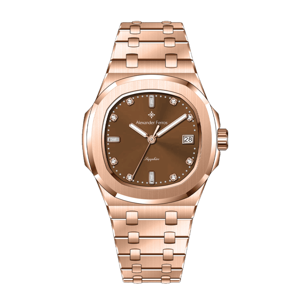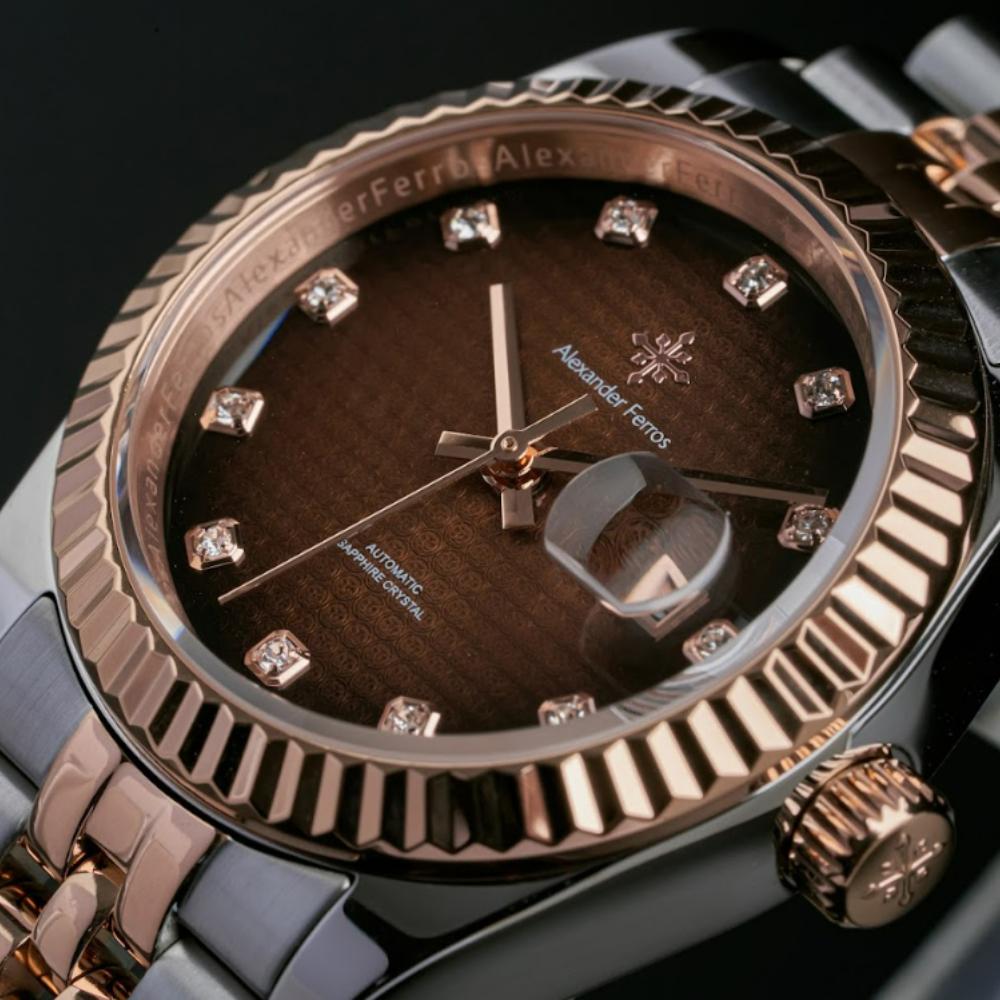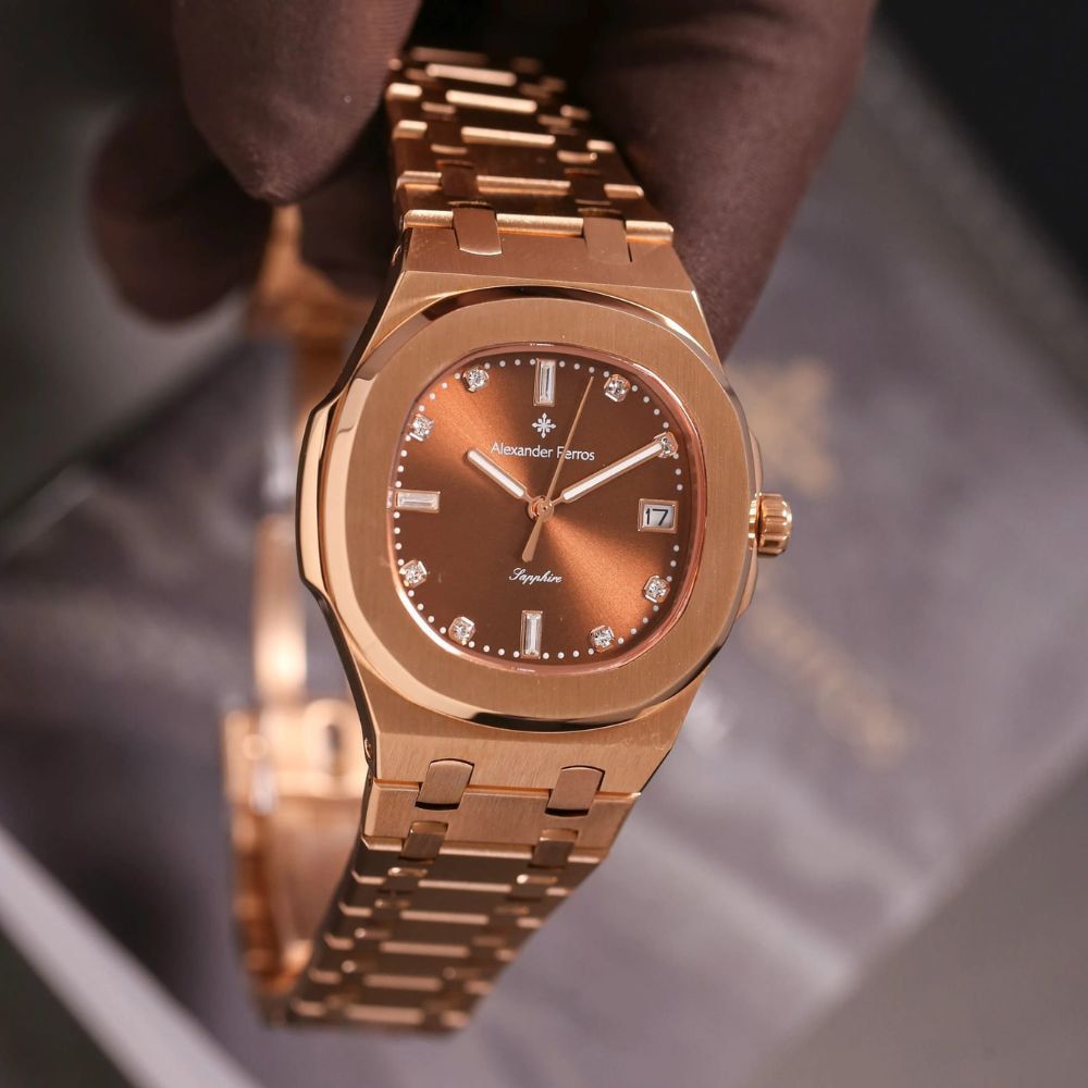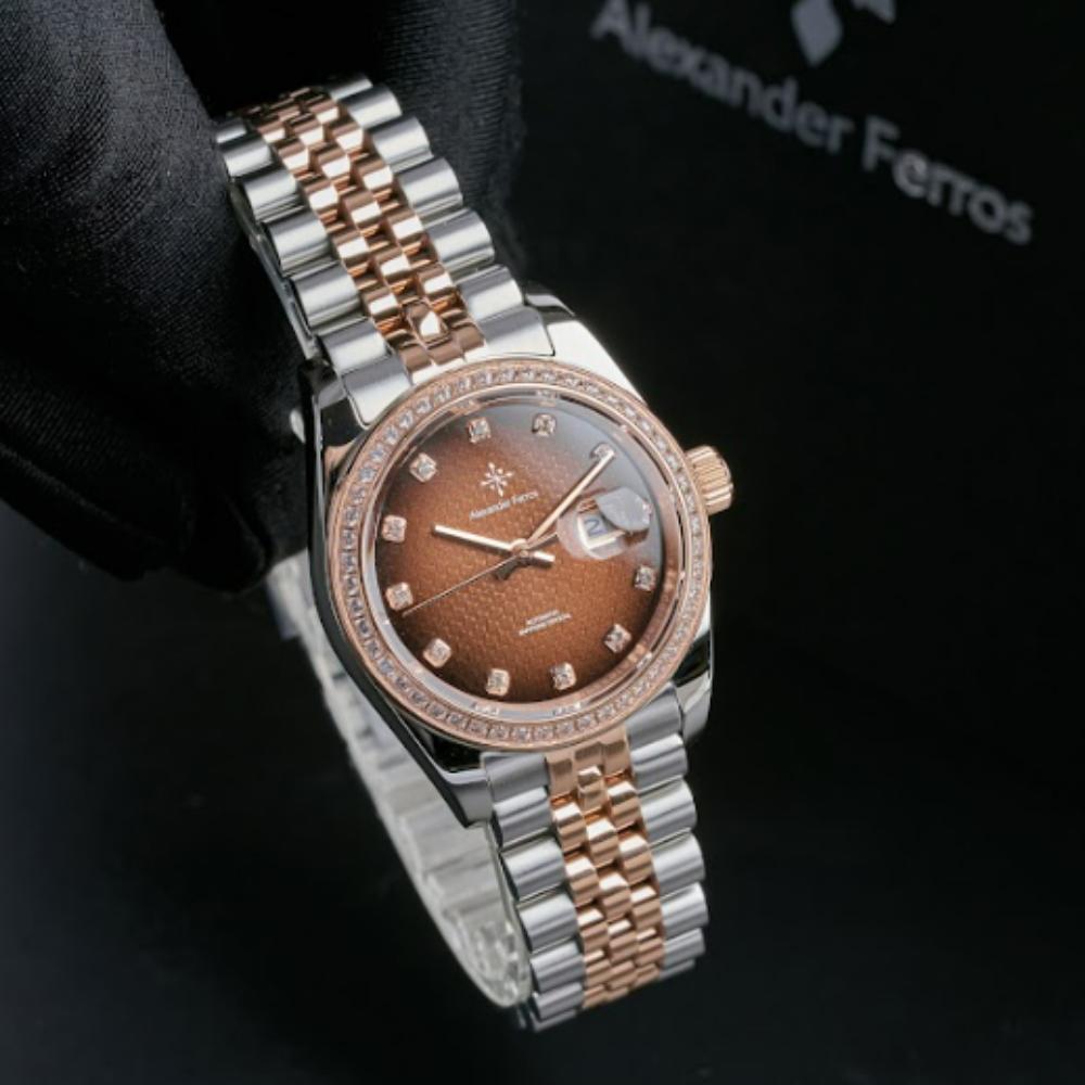 Mặt số nâu choco trên đồng hồ AF 6152R/08 được kết hợp cùng cọc đá sáng và bộ kim tinh xảo, tạo hiệu ứng phản chiếu ánh sáng rõ nét khi di chuyển. Thiết kế này giúp đồng hồ Alexferros 6152R/08 trở thành điểm nhấn nhẹ nhàng cho trang phục công sở, váy dự tiệc hoặc phong cách thanh lịch thường ngày.