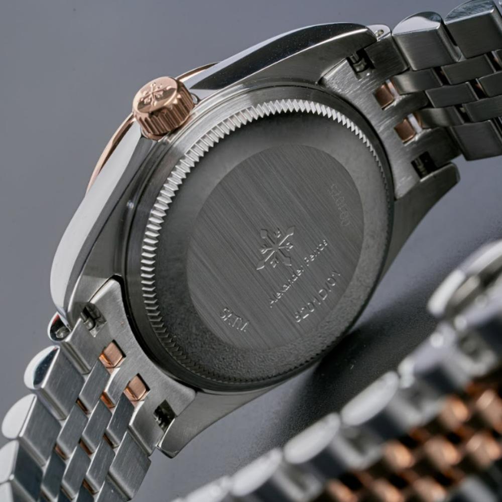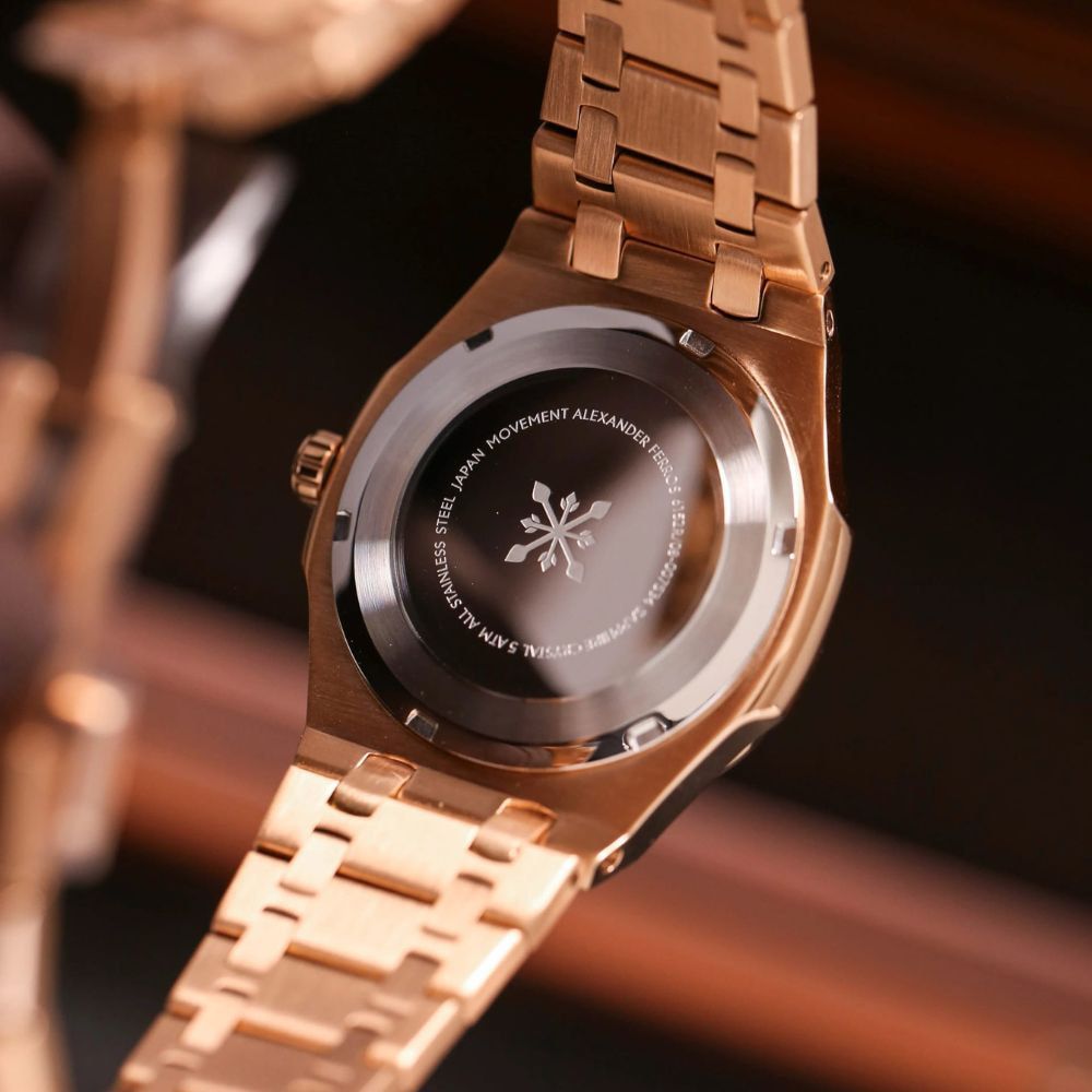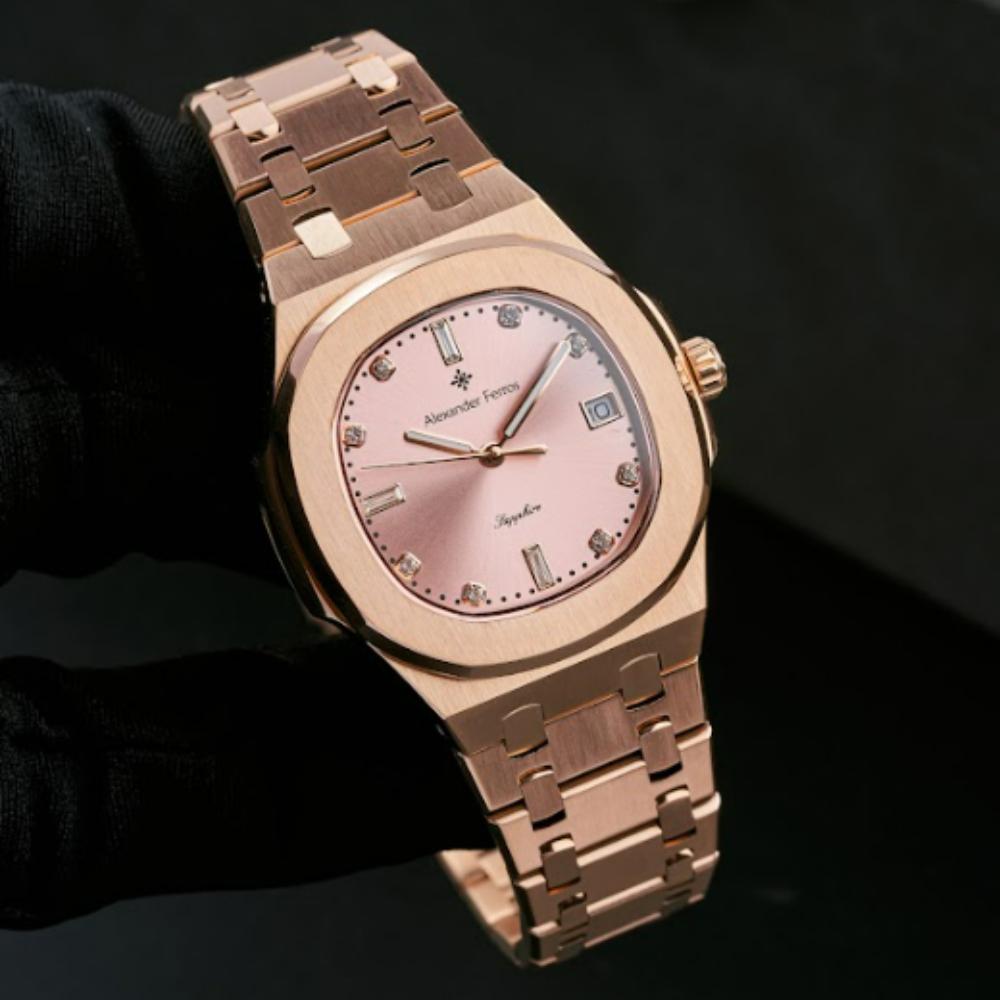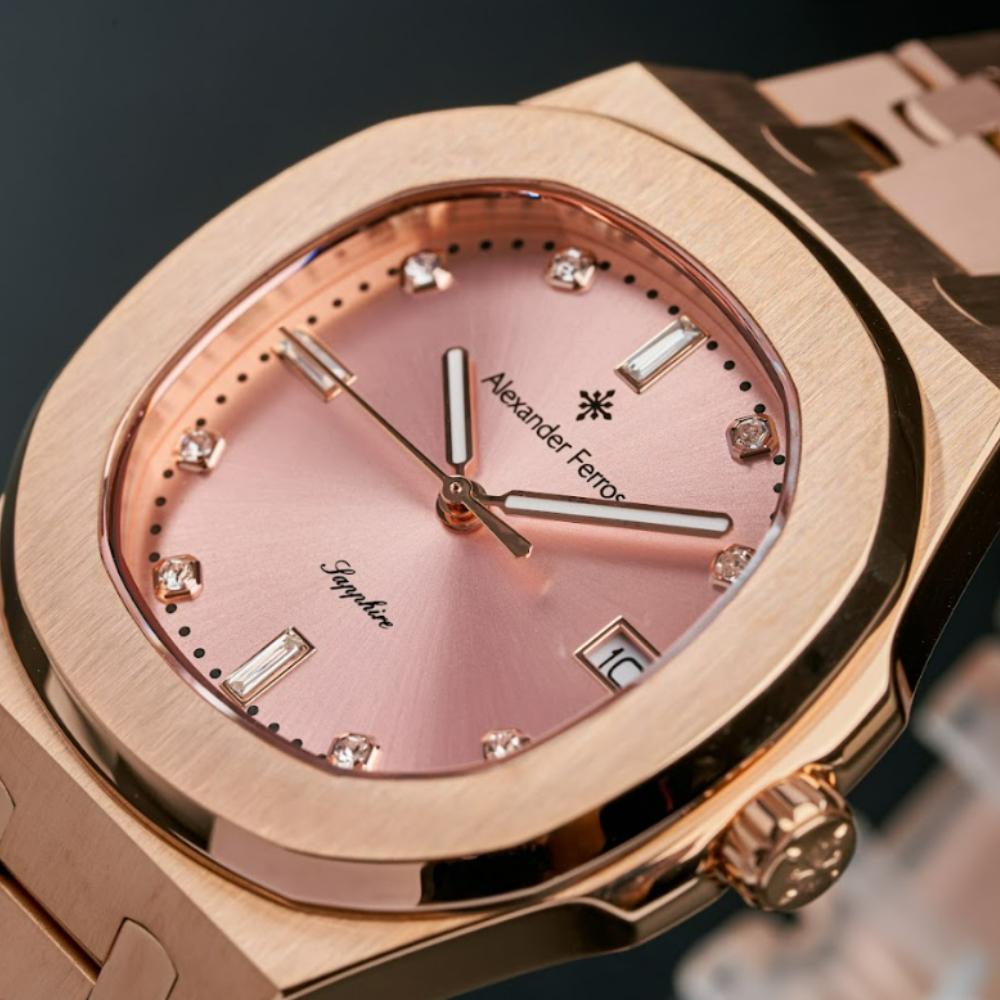 Phần vỏ của đồng hồ Alex 6152R/08 được chế tác từ thép không gỉ 316L, giúp tăng độ bền và giữ bề mặt sáng đẹp theo thời gian. Dây kim loại mạ full vàng hồng mang lại cảm giác sang trọng, đồng thời dễ phối với phụ kiện trang sức nữ. Mặt kính Sapphire chống trầy kết hợp khả năng chống nước 5 ATM giúp đồng hồ Alexander Ferros 6152R/08 đáp ứng tốt các nhu cầu sinh hoạt hàng ngày như rửa tay, đi mưa nhẹ hoặc làm việc văn phòng.
