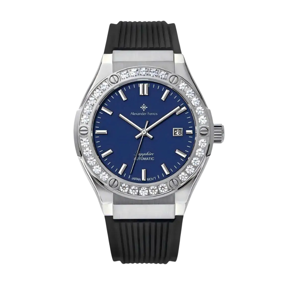 Vỏ đồng hồ Alexferros 6161S-05 được làm từ thép không gỉ 316L mạ thép, mang lại độ bền cao và khả năng chống ăn mòn tốt. Cọc số đính đá kết hợp cùng niềng đá tạo điểm nhấn sang trọng, giúp đồng hồ Alexander Ferros 6161S-05 nổi bật rõ rệt khi lên tay. Dây cao su mang lại cảm giác đeo thoải mái, phù hợp với nhịp sống năng động của nam giới hiện đại.