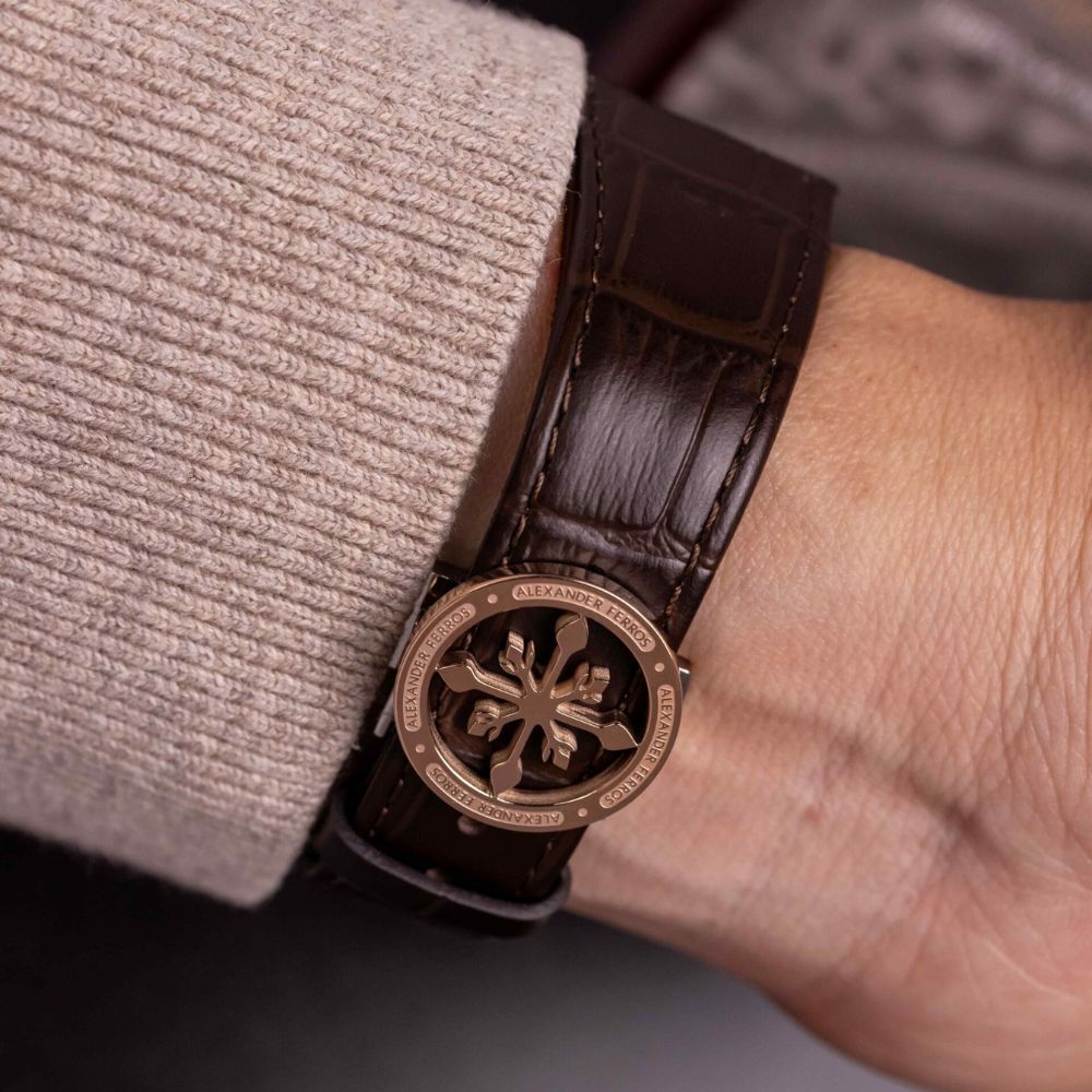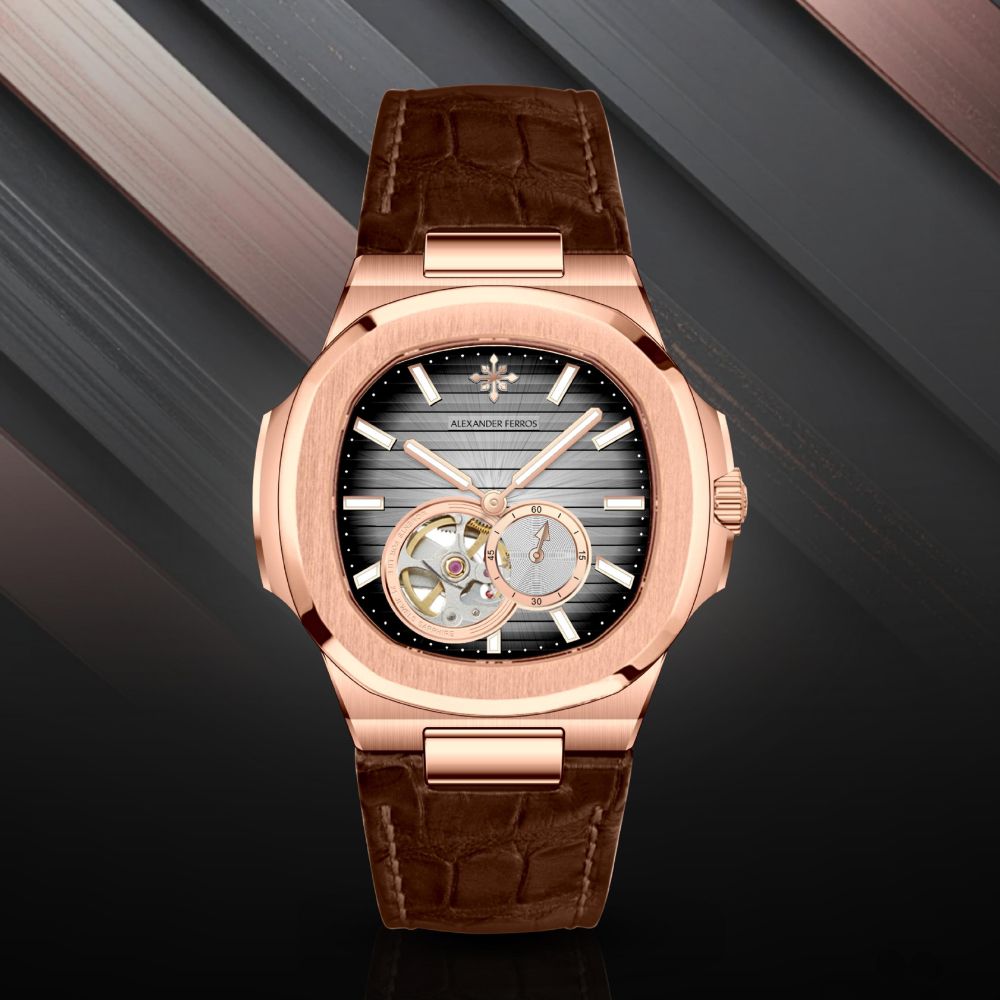 Đồng hồ Alexander Ferros 6312R-01 là mẫu đồng hồ cơ nam nổi bật với thiết kế vỏ cushion bo góc hiện đại, kết hợp sắc vàng hồng sang trọng và dây da nâu cổ điển. Mẫu AF 6312R-01 mang phong cách thể thao lịch lãm, phù hợp với những quý ông yêu thích sự khác biệt nhưng vẫn giữ nét tinh tế chuẩn đồng hồ cao cấp. Đây là một trong những thiết kế tiêu biểu của dòng đồng hồ Alexander Ferros dành cho nam, dễ dàng gây ấn tượng ngay từ cái nhìn đầu tiên.