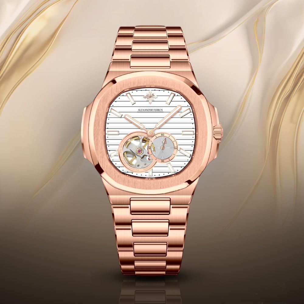 Đồng hồ Alexander Ferros 6312R/02 là mẫu đồng hồ cơ nam cao cấp thuộc danh mục đồng hồ Alexander Ferros dành cho nam, nổi bật với thiết kế vàng hồng sang trọng kết hợp mặt số trắng kẻ ngang tinh tế. Phiên bản AF 6312R/02 mang đến diện mạo lịch lãm, hiện đại nhưng vẫn giữ trọn tinh thần cơ khí đặc trưng của dòng Alex Ferros.