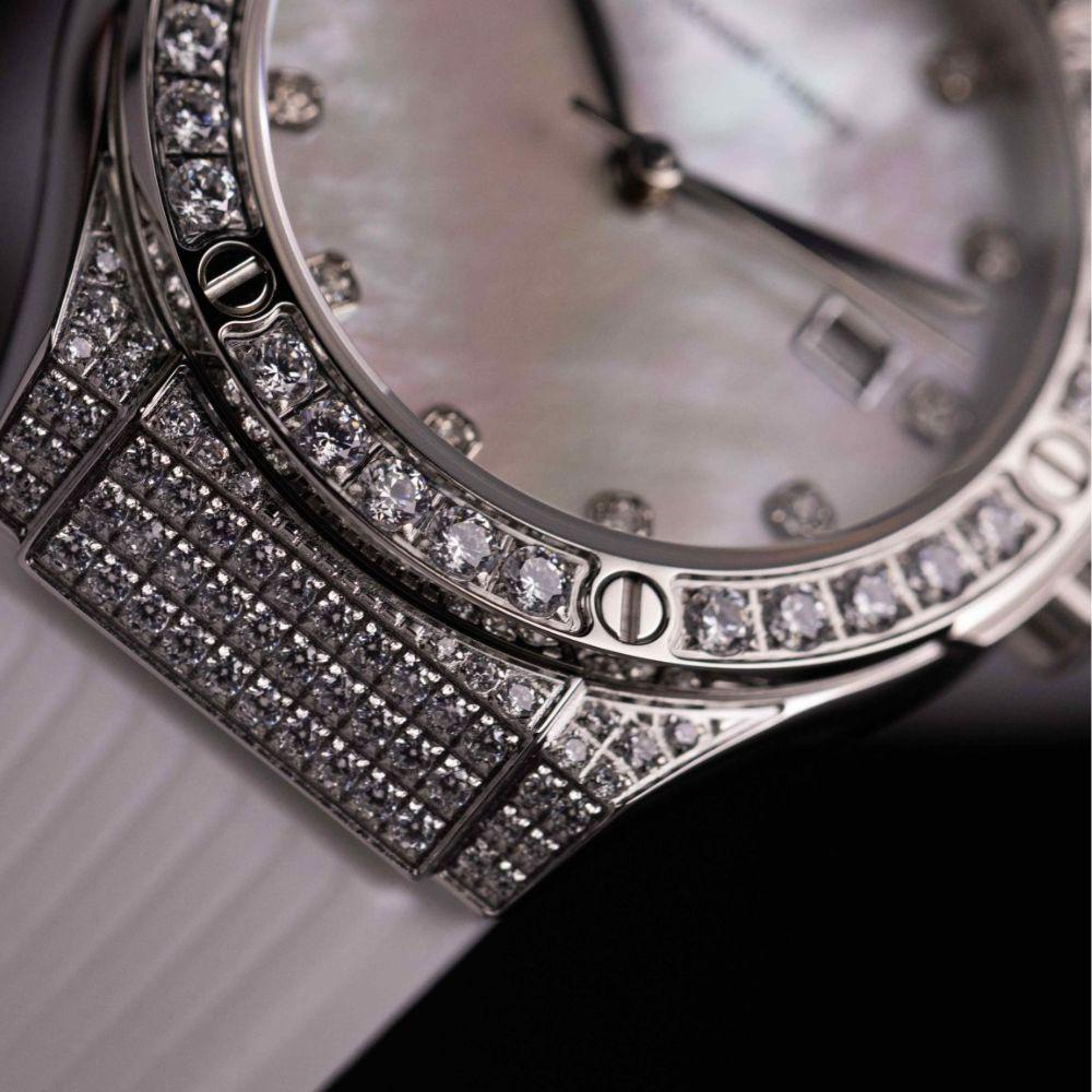 Mặt số trắng trang nhã, họa tiết vân nhẹ, cọc số La Mã cổ điển kết hợp kim xanh thanh mảnh, mang lại vẻ đẹp tinh tế, dễ nhìn.