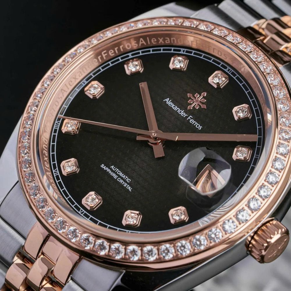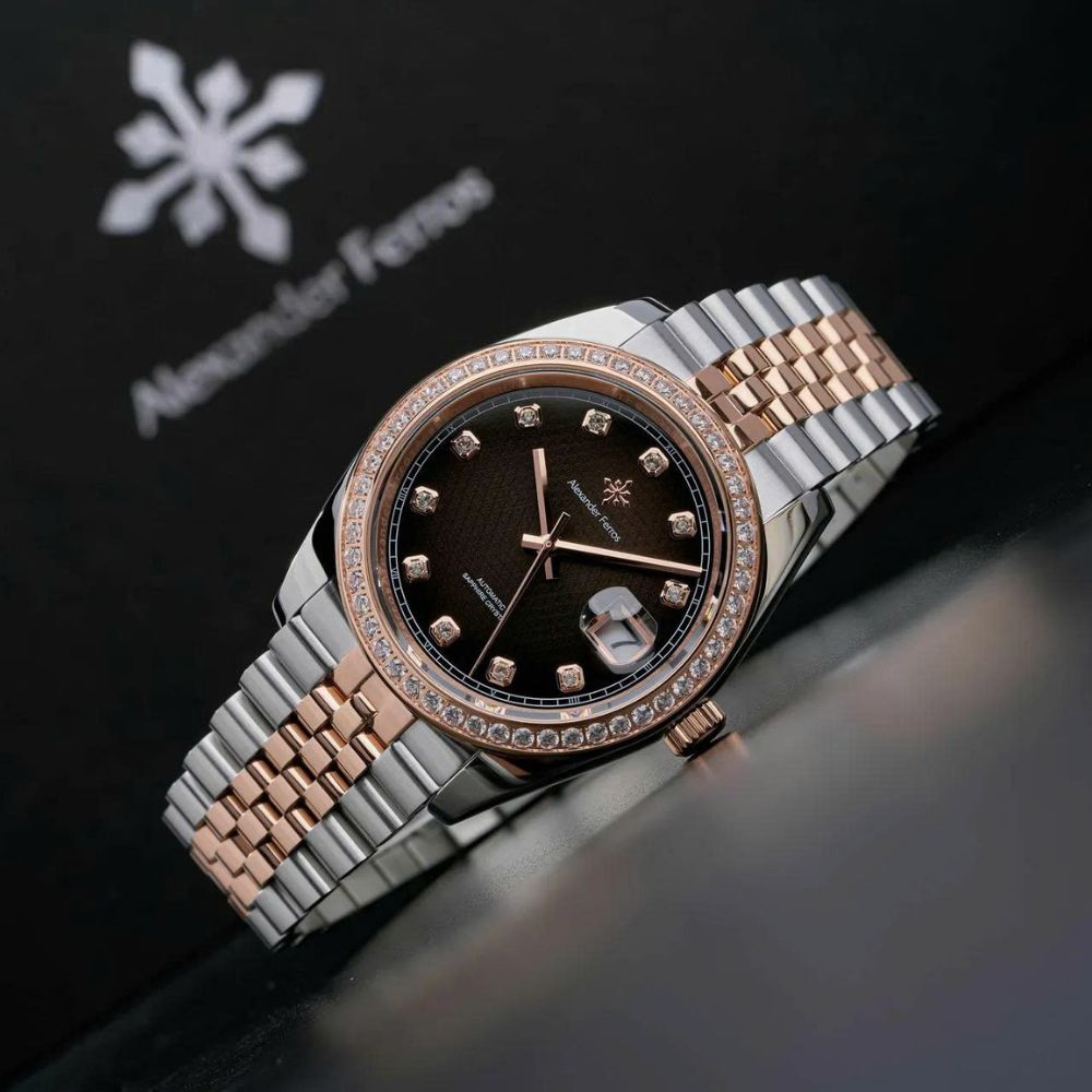 Đồng hồ AF 8021D/01 sở hữu vỏ thép không gỉ 316L kết hợp mạ demi vàng hồng và bạc, tạo điểm nhấn sang trọng ngay từ ánh nhìn đầu tiên. Niềng đá cùng cọc số đính đá giúp mặt số đen trở nên nổi bật, tăng chiều sâu và cảm giác cao cấp cho tổng thể thiết kế. Kích thước mặt số 40mm mang lại sự cân đối, dễ đeo và phù hợp với cổ tay nam giới hiện đại.