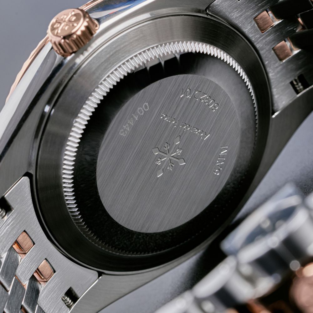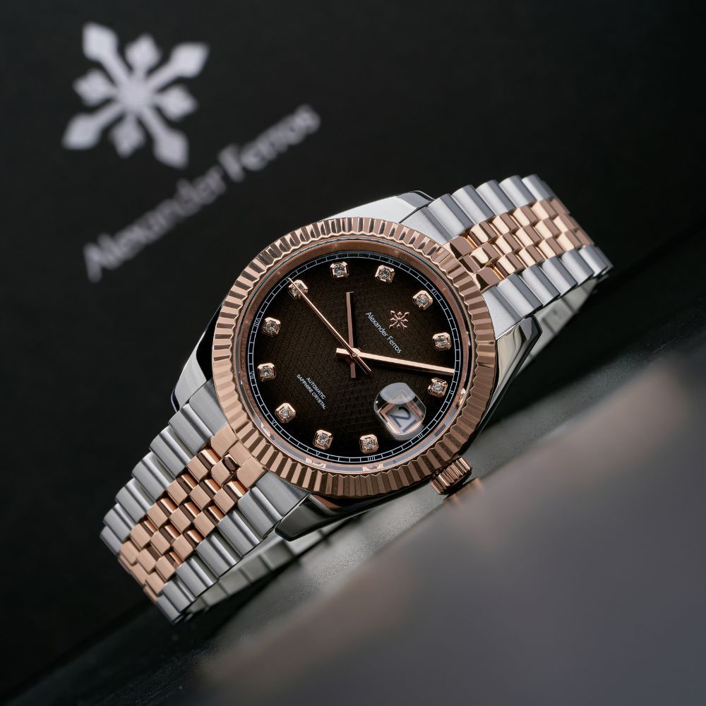 Đồng hồ Alexander Ferros 8032D/01 được chế tác từ thép không gỉ 316L, hoàn thiện mạ demi vàng hồng bạc giúp tăng độ bền và tính thẩm mỹ. Thiết kế mặt tròn 40mm của đồng hồ AF 8032D/01 mang phong cách homage lấy cảm hứng từ đồng hồ Rolex, tạo cảm giác quen thuộc nhưng vẫn giữ được dấu ấn riêng. Mặt số đen của đồng hồ Alexander 8032D/01 kết hợp cọc số kim thanh mảnh giúp tổng thể hài hòa, sang trọng và dễ quan sát.