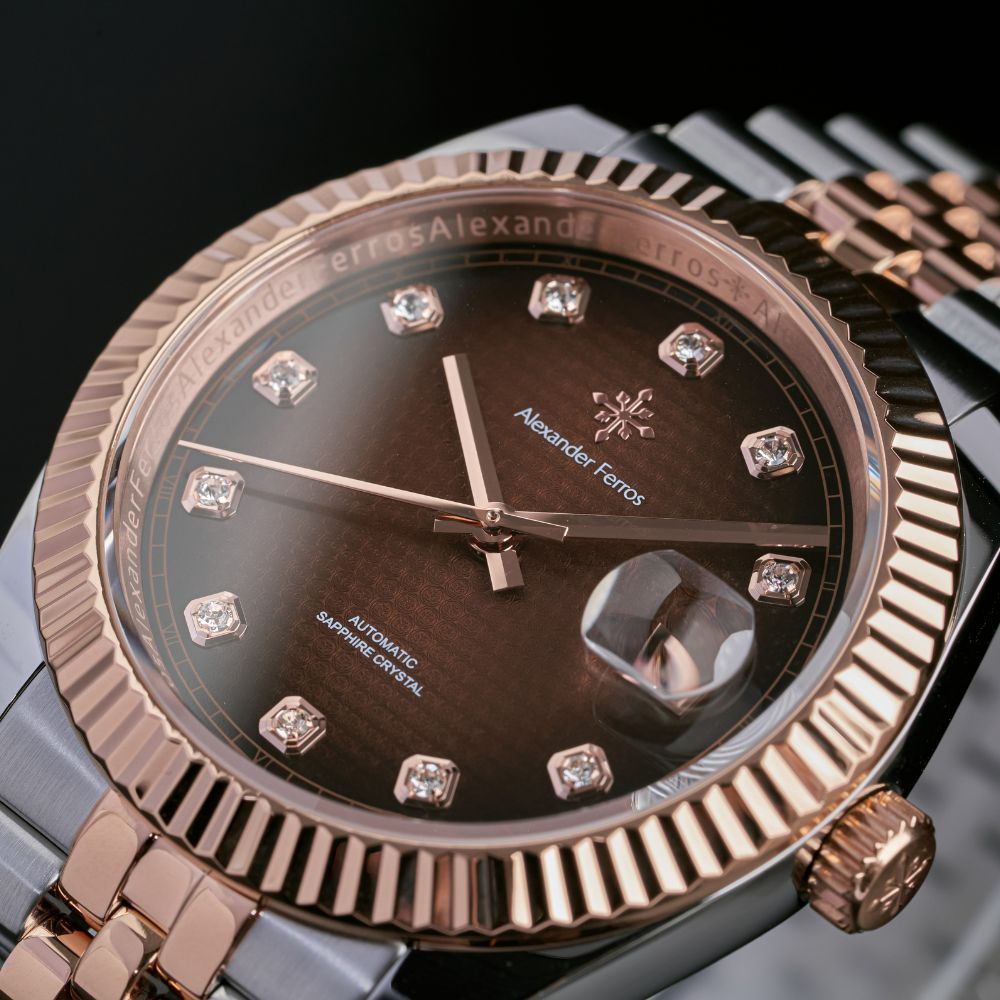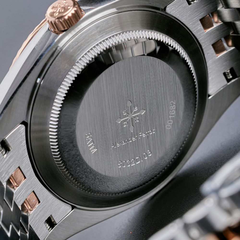 Đồng hồ Alexander Ferros 8032D/08 được chế tác từ thép không gỉ 316L, hoàn thiện mạ demi vàng hồng bạc mang lại cảm giác cao cấp và bền bỉ khi sử dụng. Thiết kế mặt tròn 40mm trên đồng hồ AF 8032D/08 lấy cảm hứng từ phong cách đồng hồ Rolex kinh điển, dễ đeo và phù hợp với nhiều kích thước cổ tay nam giới. Mặt số nâu choco của đồng hồ Alexander 8032D/08 kết hợp cọc số kim thanh mảnh giúp tổng thể trở nên tinh tế, dễ quan sát và mang đậm dấu ấn thời trang.