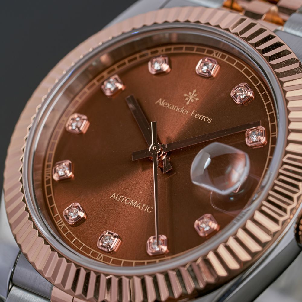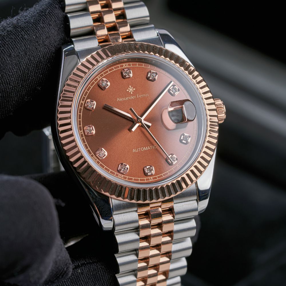 Ở phiên bản đồng hồ Alexander 8132D/08, vỏ thép không gỉ 316L được hoàn thiện chắc chắn, kết hợp niềng mạ vàng hồng tạo điểm nhấn nổi bật trên nền mặt số nâu choco ấm áp. Thiết kế demi vàng hồng và bạc giúp đồng hồ Alex 8132D/08 mang phong cách sang trọng, dễ nhận diện và phù hợp với nhiều môi trường sử dụng. Cọc số kim gọn gàng, bố cục mặt số hài hòa cùng mặt kính sapphire trong suốt giúp đồng hồ AF 8132D/08 giữ được vẻ ngoài cao cấp, hiện đại theo tinh thần homage của những mẫu đồng hồ Rolex nổi tiếng.