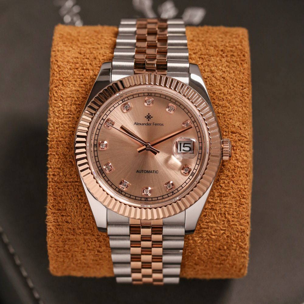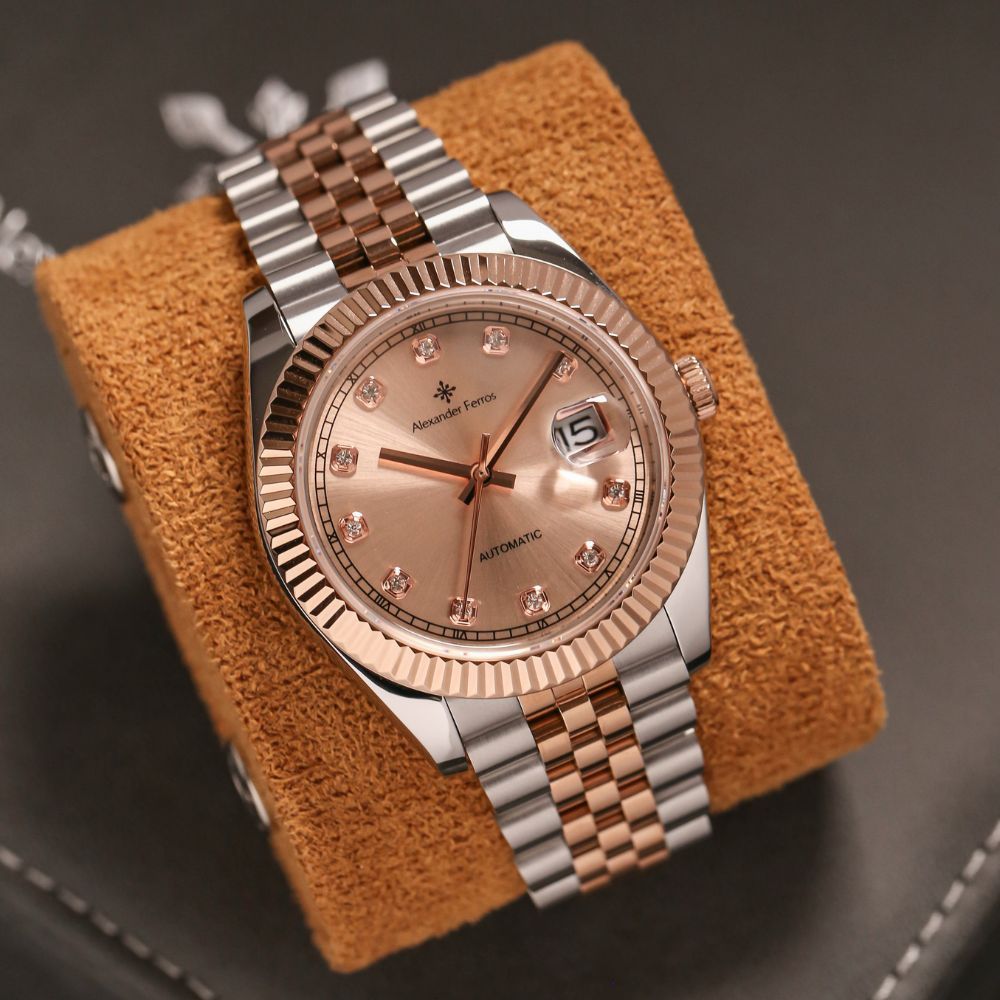 Đồng hồ Alexander Ferros 8132D/15 sở hữu kiểu dáng mặt tròn 40mm cân đối, lấy cảm hứng homage từ các mẫu đồng hồ Rolex kinh điển. Vỏ thép không gỉ 316L kết hợp mạ demi vàng hồng và bạc giúp đồng hồ Alex 8132D/15 tạo hiệu ứng sang trọng rõ nét trên cổ tay. Mặt số Sundust cùng cọc số kim mang lại cảm giác tinh tế, dễ quan sát và phù hợp với nhiều phong cách từ công sở đến sự kiện trang trọng.