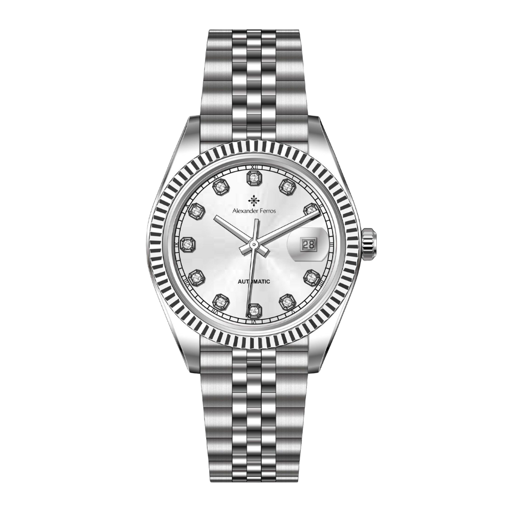 Đồng hồ Alexander Ferros 8132S/02 sở hữu kiểu dáng mặt tròn cổ điển kết hợp phong cách homage lấy cảm hứng từ các mẫu đồng hồ Rolex nổi tiếng. Vỏ thép không gỉ 316L mạ thép giúp đồng hồ Alex 8132S/02 giữ được vẻ ngoài bền bỉ, sáng đẹp theo thời gian. Mặt số màu trắng cùng cọc số kim mang lại cảm giác rõ ràng, dễ quan sát, đồng thời tạo nên vẻ thanh lịch đặc trưng cho dòng đồng hồ Alexander 8132S/02.