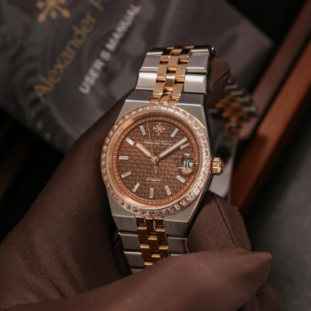 Mặt số màu nâu choco của đồng hồ Alexander Ferros 8181D/082 tạo chiều sâu thị giác, kết hợp cọc số đá và niềng đá được hoàn thiện tỉ mỉ, mang lại hiệu ứng ánh sáng tinh tế khi quan sát trực tiếp. Thiết kế mặt tròn kích thước 36mm giúp mẫu đồng hồ Alexferros này cân đối, gọn gàng và dễ đeo trong nhiều hoàn cảnh. Mặt kính sapphire hỗ trợ chống trầy xước hiệu quả, giữ cho đồng hồ luôn sáng rõ theo thời gian.