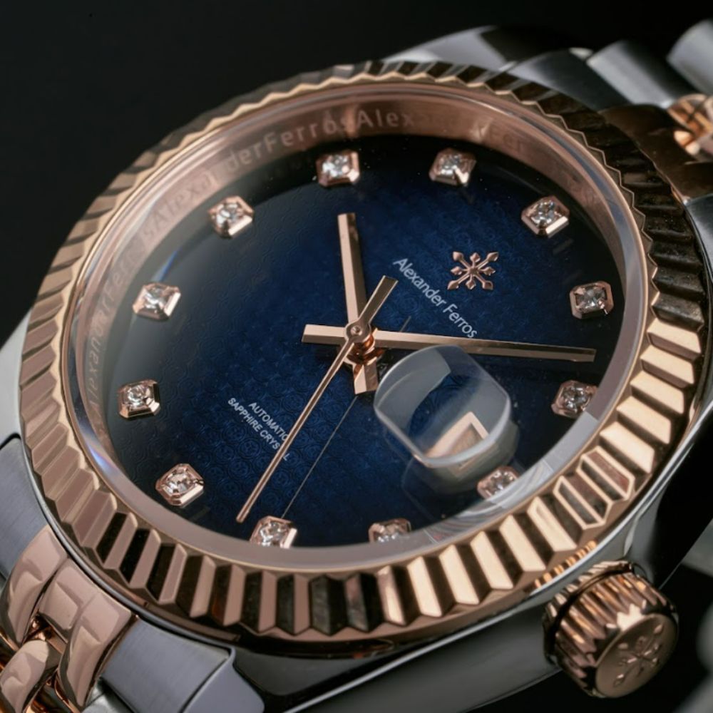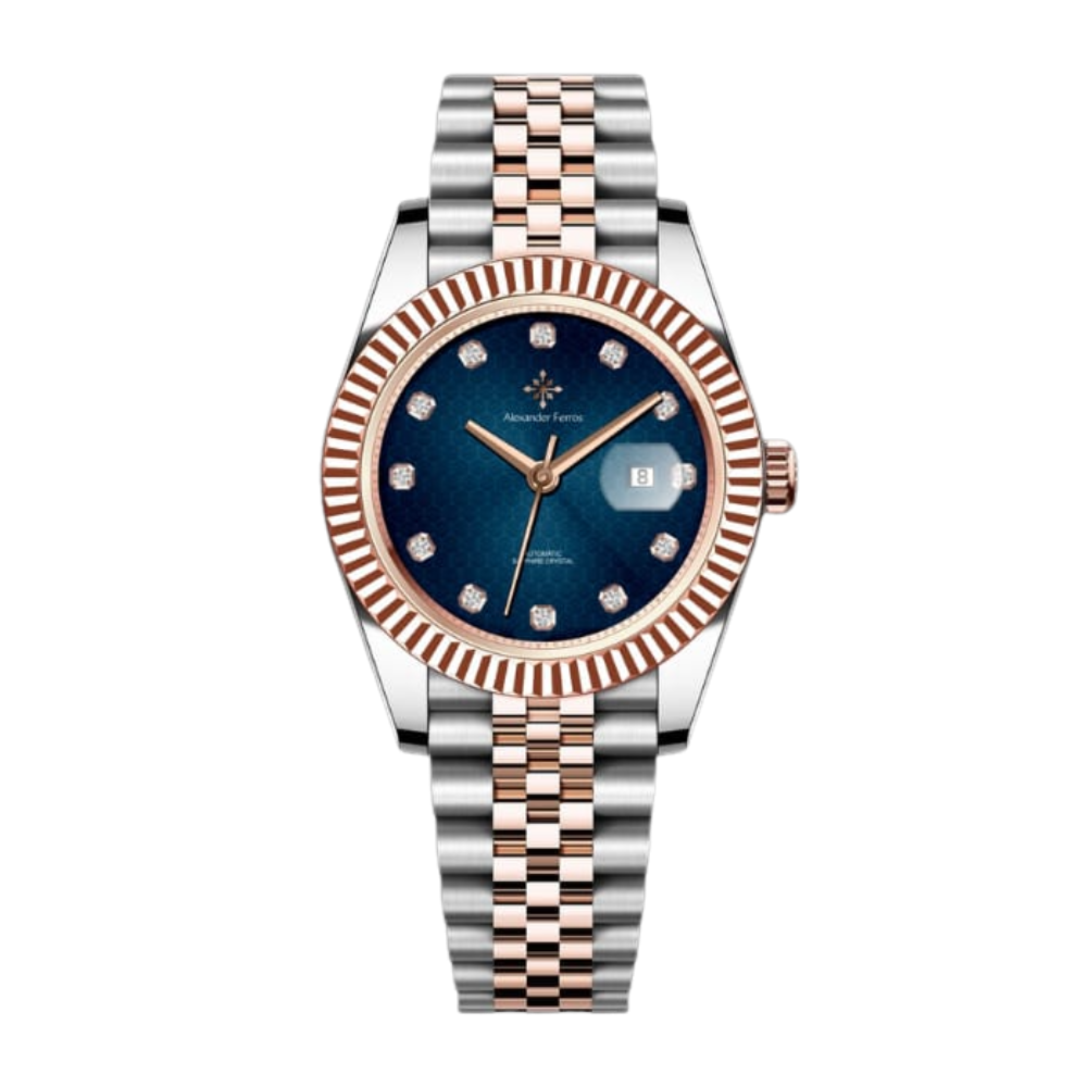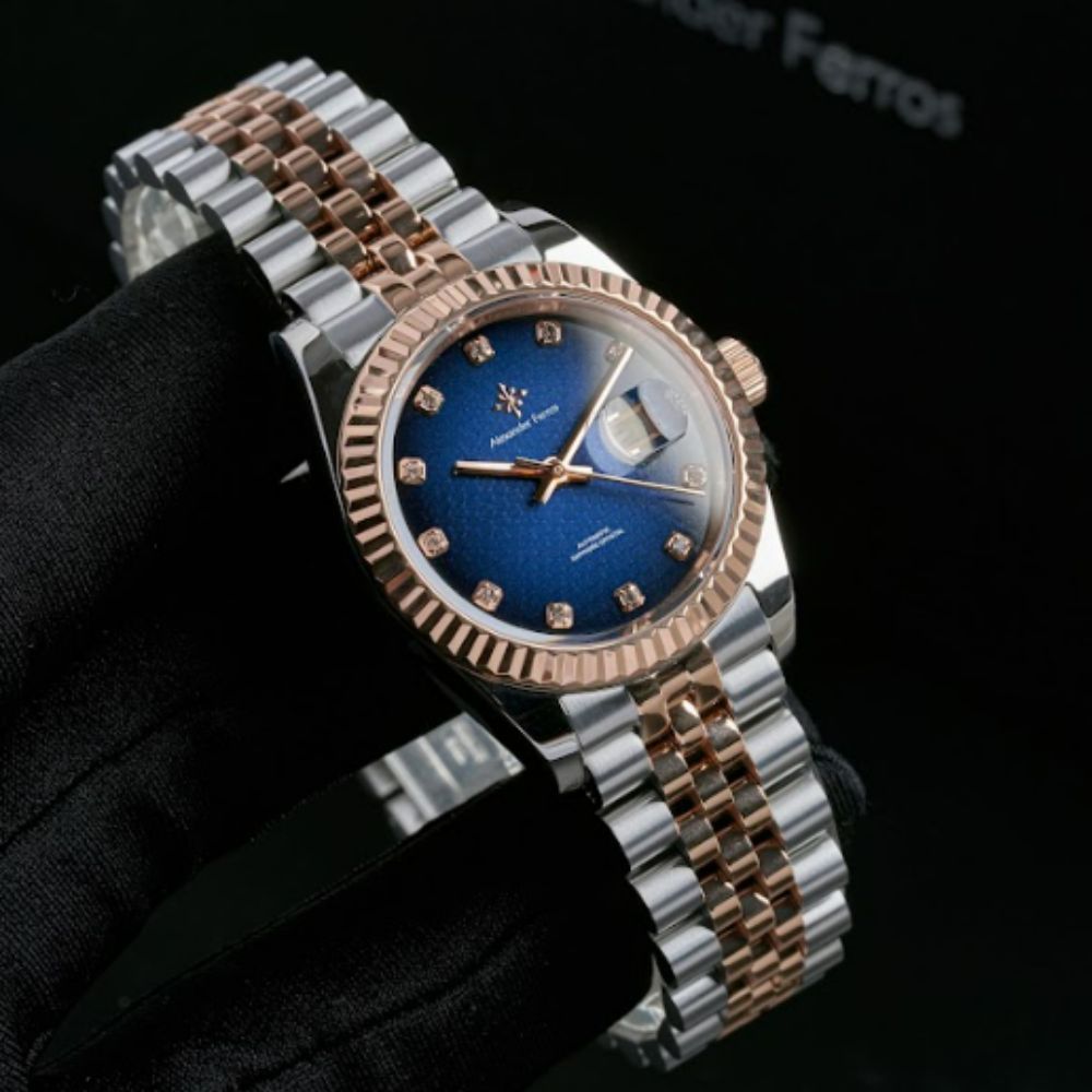 Đồng Hồ Alexander Ferros 8192D/05 là mẫu đồng hồ nữ cơ nổi bật với thiết kế demi vàng hồng phối bạc sang trọng, kết hợp mặt số xanh dương đậm cuốn hút. Sản phẩm hướng đến những quý cô yêu thích phong cách thanh lịch, tinh tế nhưng vẫn muốn tạo điểm nhấn rõ nét trên cổ tay.