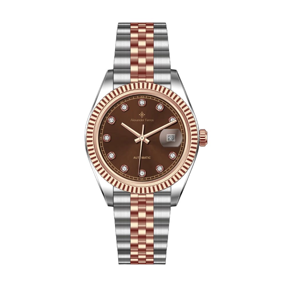 Đồng hồ Alexander Ferros 8232D/08 là mẫu đồng hồ cơ nam AF mang phong cách demi vàng hồng sang trọng, lấy cảm hứng từ mẫu đồng hồ cơ kiểu dáng Rolex, nổi bật với vẻ ngoài lịch lãm, hiện đại và phù hợp cho người tìm kiếm đồng hồ nam đẹp, giá rẻ tại HCM.