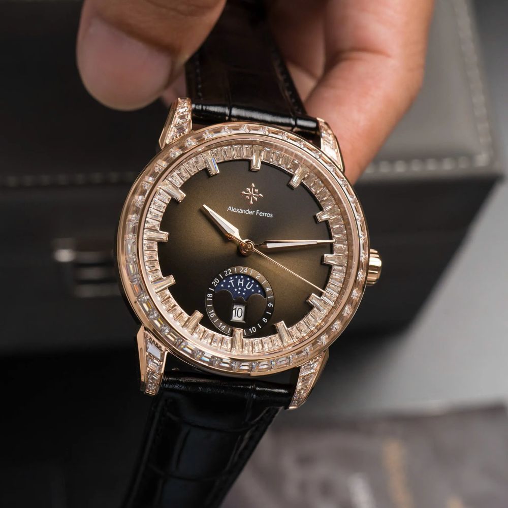 Điểm nhấn của đồng hồ Alexander Ferros 9081R-01 nằm ở mặt số màu đen sâu, kết hợp cọc số đá và niềng đá được sắp xếp hài hòa, tạo cảm giác sang trọng nhưng vẫn giữ được nét nam tính đặc trưng. Thiết kế mặt tròn kích thước 40mm giúp đồng hồ Alexander Ferros 9081R-01 dễ đeo và cân đối trên cổ tay nam giới.
