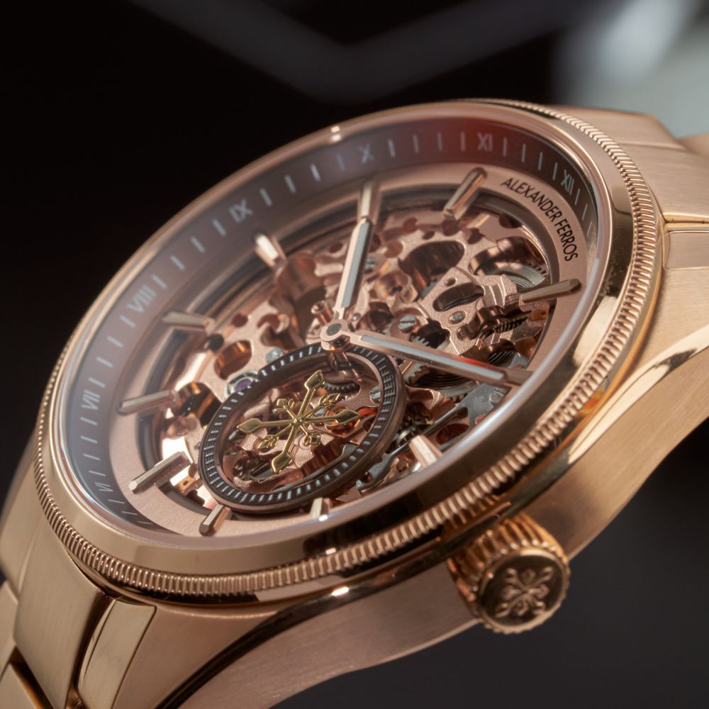 Đồng hồ Alexander Ferros 9262R/08 gây ấn tượng với thiết kế lộ cơ Skeleton đầy chiều sâu, phô bày hệ thống bánh răng chuyển động tinh vi. Mặt số hai lớp độc đáo với vòng nền nâu trầm kết hợp cọc số La Mã cổ điển, tạo cảm giác vừa cổ kính vừa hiện đại.