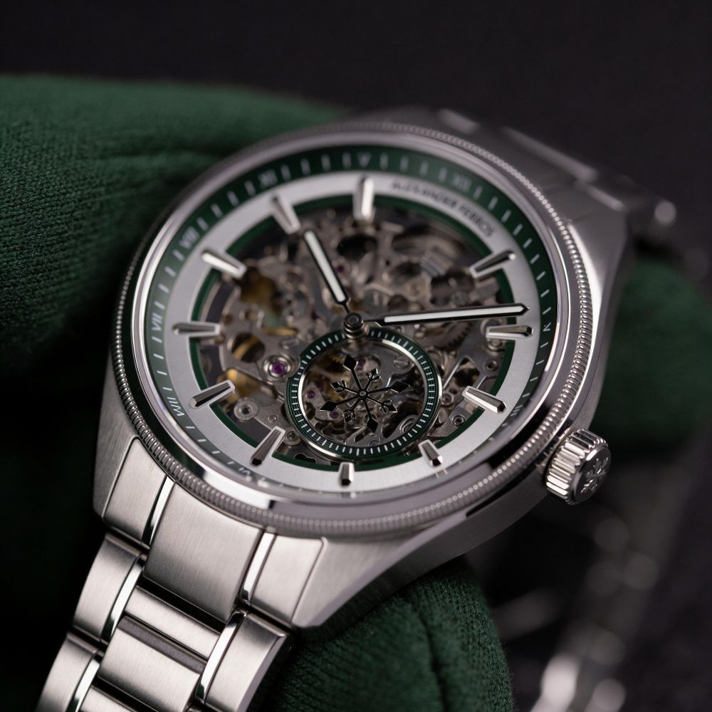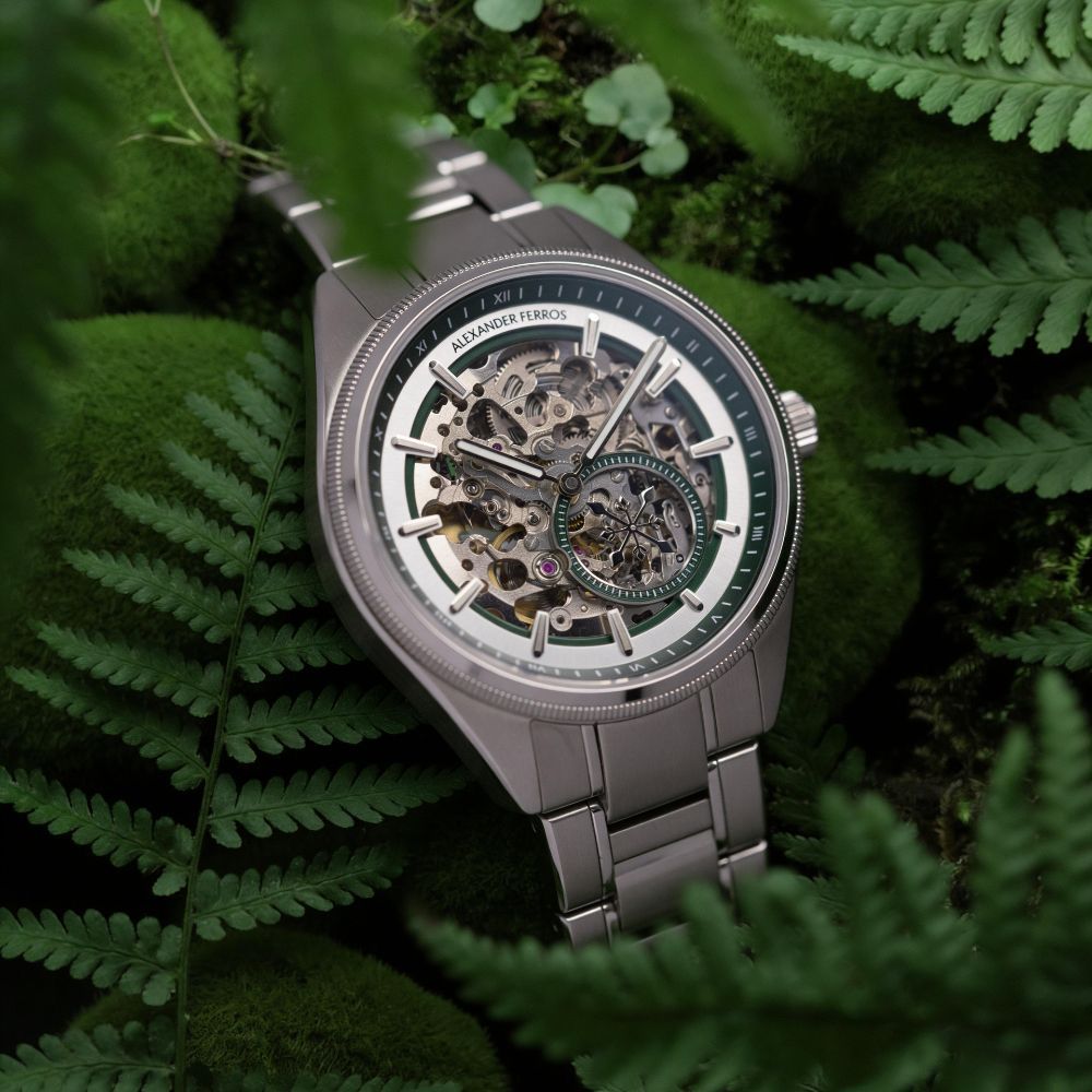 Điểm nhấn nổi bật của mẫu đồng hồ cơ nam Alexander Ferros này nằm ở mặt số skeleton lộ cơ đầy ấn tượng. Các bánh răng và chi tiết máy được phô bày trực tiếp dưới lớp kính trong suốt, mang lại vẻ đẹp cơ khí sống động và cuốn hút. Vòng chapter ring màu xanh lá sang trọng bao quanh mặt số tạo nên điểm nhấn khác biệt, đồng thời giúp tăng chiều sâu thị giác cho thiết kế tổng thể.