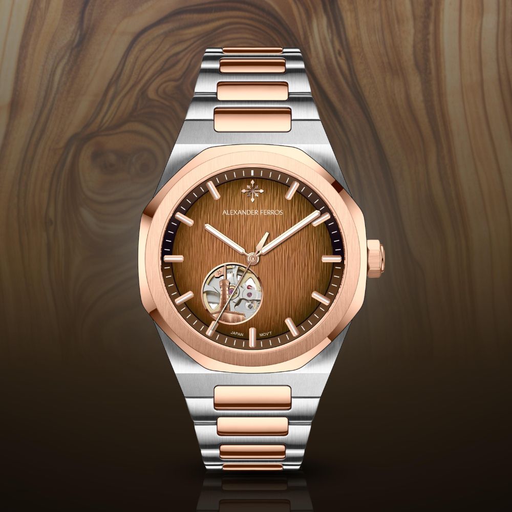 Mặt số màu nâu vân gỗ của đồng hồ Alexander Ferros 9292D/08 mang đến cảm giác ấm áp và chiều sâu thị giác rõ nét. Cọc số dạng vạch và bộ kim thanh mảnh được phủ dạ quang, hỗ trợ quan sát thời gian rõ ràng trong điều kiện thiếu sáng. Thiết kế Open Heart tại vị trí 7 giờ để lộ chuyển động cơ học bên trong, kết hợp hình ảnh Cột cờ Dinh Độc Lập chi tiết nhận diện đặc trưng trên các mẫu đồng hồ ferros, tạo nên bản sắc riêng cho dòng alexander 9292.