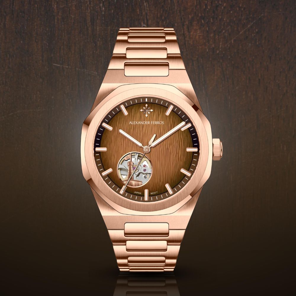 Mặt số màu nâu vân gỗ là chi tiết tạo nên bản sắc riêng cho dòng Alexander Ferros 9292. Họa tiết vân gỗ được hoàn thiện tỉ mỉ, kết hợp cùng bộ kim và cọc số dạng vạch phủ dạ quang, giúp người dùng dễ dàng quan sát thời gian trong điều kiện thiếu sáng. Thiết kế Open Heart tại vị trí 7 giờ, kết hợp hình ảnh Cột cờ Dinh Độc Lập mang ý nghĩa biểu tượng, tạo điểm nhấn vừa nghệ thuật vừa đậm chất thương hiệu alexander ferros.