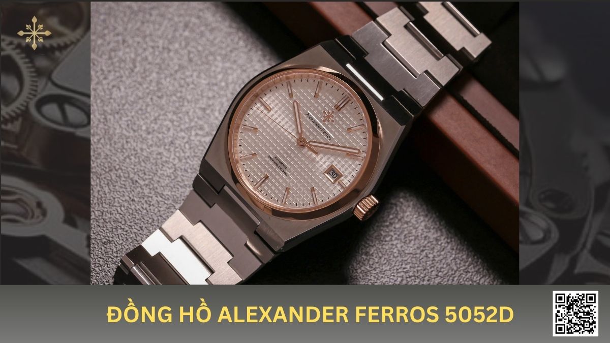 5052D/02 nổi bật với mặt số vân caro kết hợp dây thép, niềng vàng hồng và cọc số đá tinh tế. Đây là lựa chọn phù hợp cho người tìm kiếm đồng hồ Alexander Ferros PRX thanh lịch và dễ đeo.