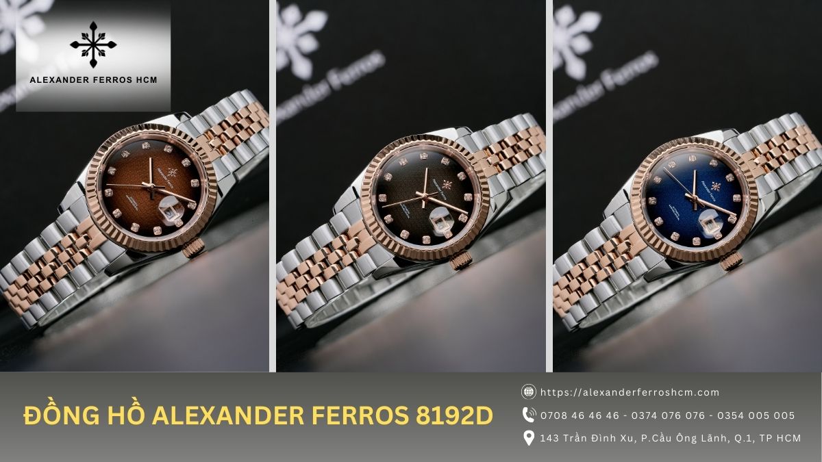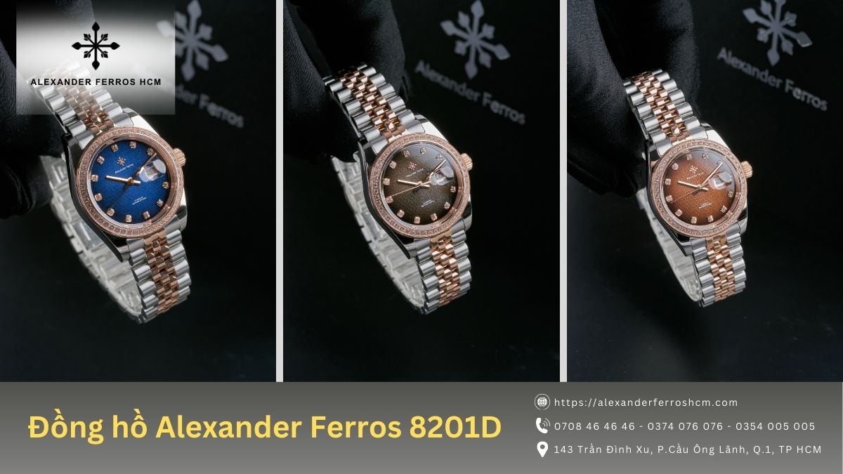 Đồng hồ Alexander Ferros 8201D mang phong cách thanh lịch, sang trọng với thiết kế demi vàng hồng - thép hài hòa. Cọc số đá và niềng đá tạo điểm nhấn lấp lánh tinh tế, kết hợp 3 phiên bản mặt số đen, xanh navy và nâu choco, phù hợp nhiều gu thẩm mỹ khác nhau.