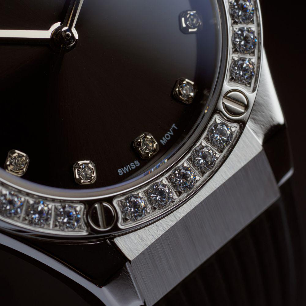 Mẫu đồng hồ gây ấn tượng với mặt số nâu chocolate sang trọng, cọc số đính đá tinh xảo. Dây demi ôm tay mang lại cảm giác thoải mái, phù hợp với phong cách thanh lịch và nhẹ nhàng.