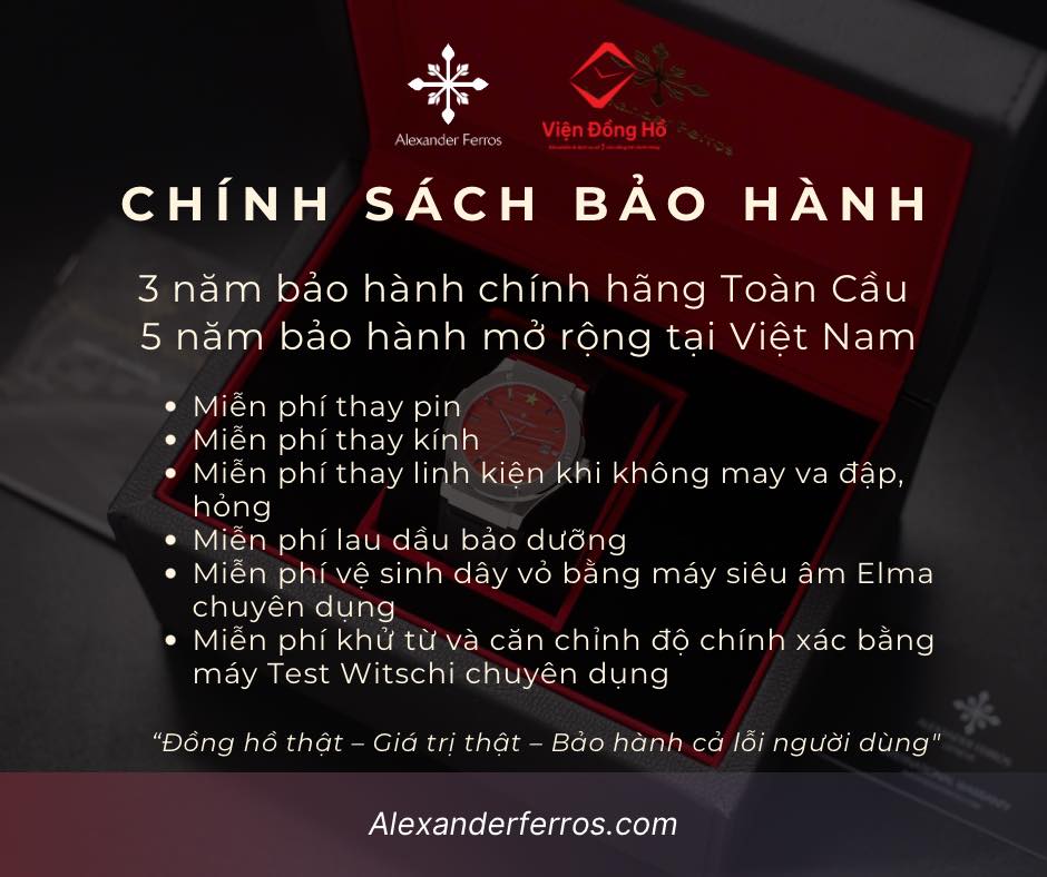 Alexander Ferros chú trọng không chỉ vào sản phẩm mà còn vào hành trình trải nghiệm của khách hàng. Thương hiệu áp dụng chính sách bảo hành toàn cầu 3 năm và mở rộng đến 5 năm tại hệ thống Bệnh Viện Đồng Hồ.